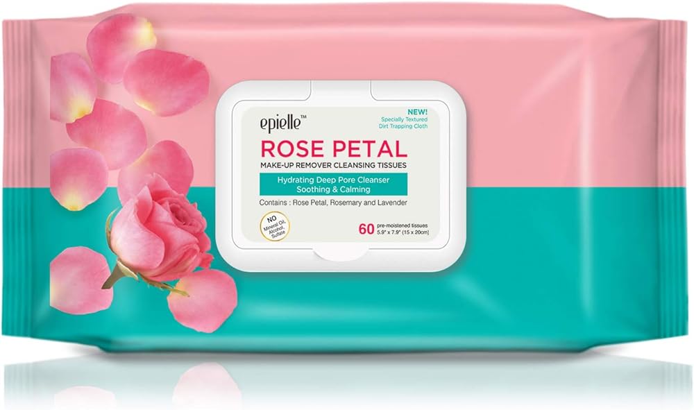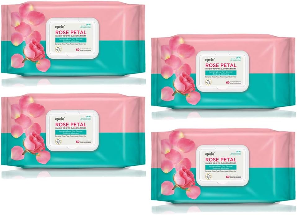 مناديل تنظيف مزيل المكياج من Epielle Rose Petal (60 منديل مبلل مسبقًا في كل عبوة) - لا تسبب الحساسية - مهدئة ومهدئة - بدون زيوت معدنية أو كحول أو كبريتات - 4 قطع (4 عبوات من بتلات الورد)