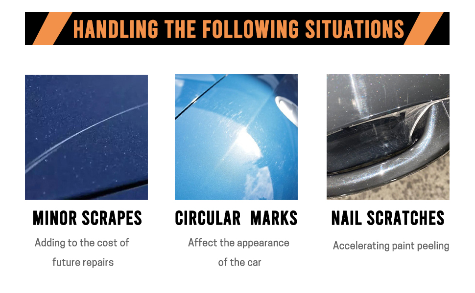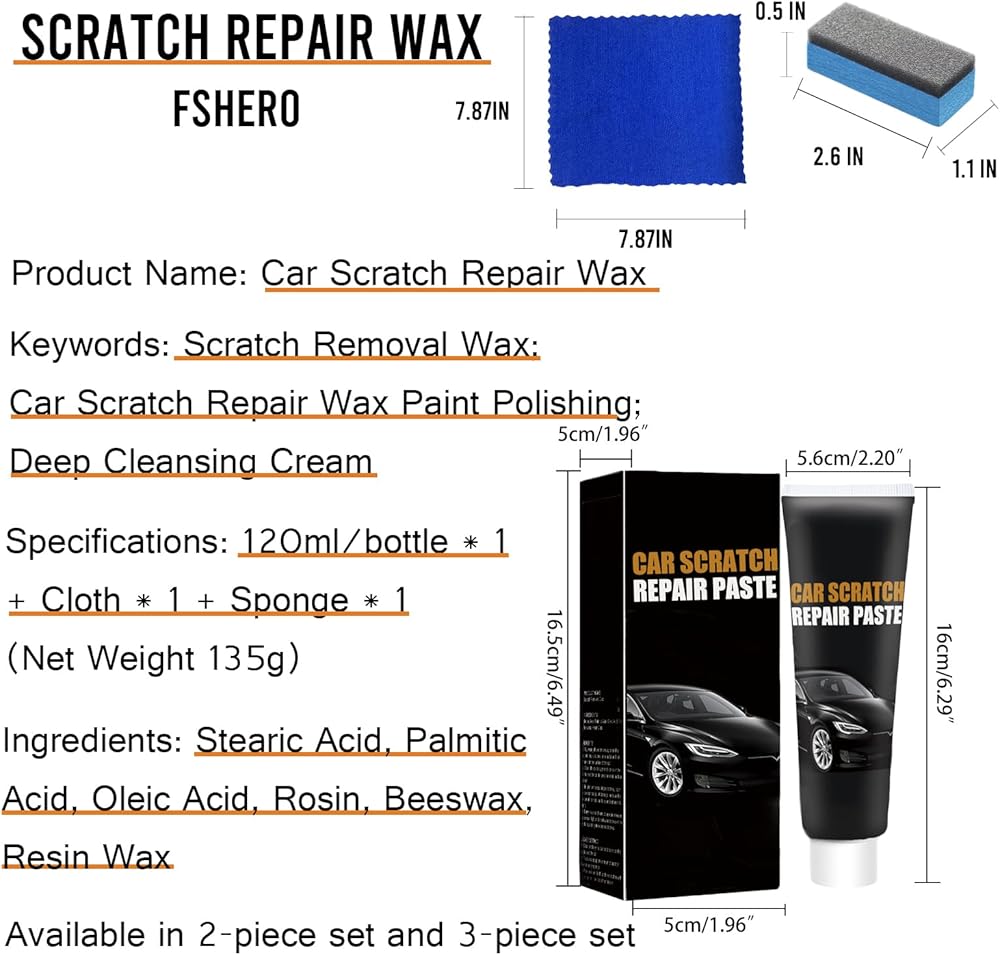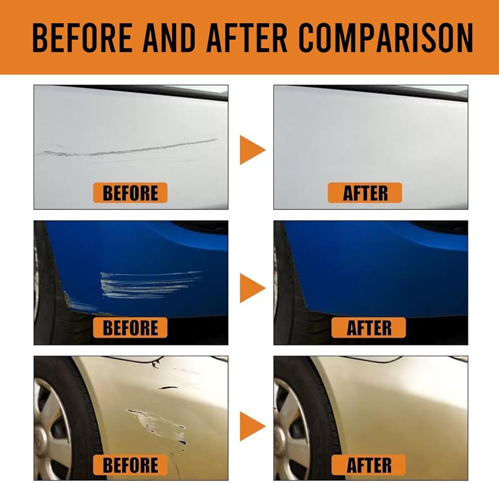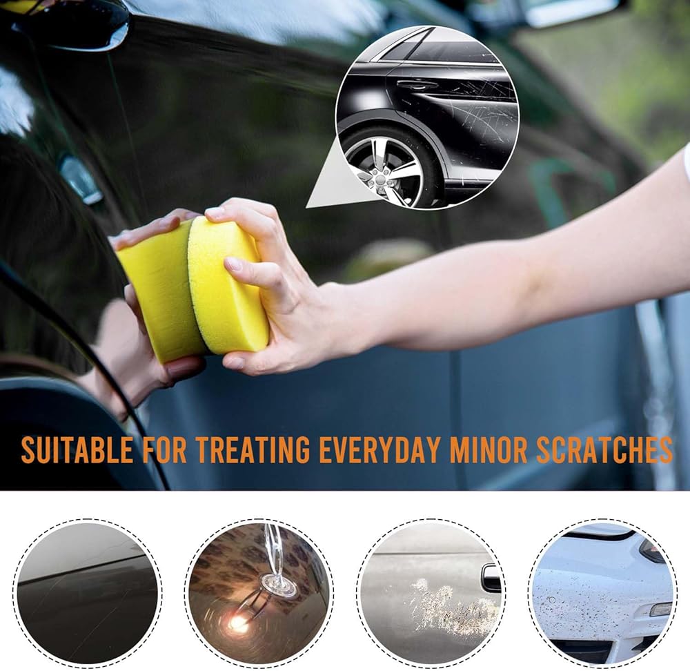 【سهلة الاستخدام】سهلة الاستخدام. قم بتحضير منطقة الخدش عن طريق إزالة الأوساخ والشمع، ثم ضع الكريم على الإسفنجة المرفقة. اعمل على الخدش بلطف حتى يختفي، ثم امسح الشمع الكريمي الزائد.