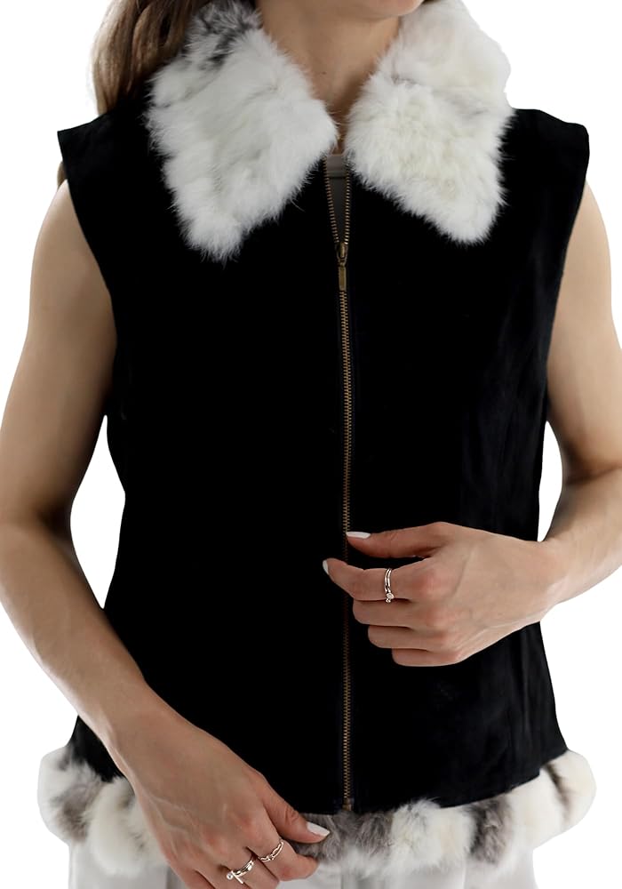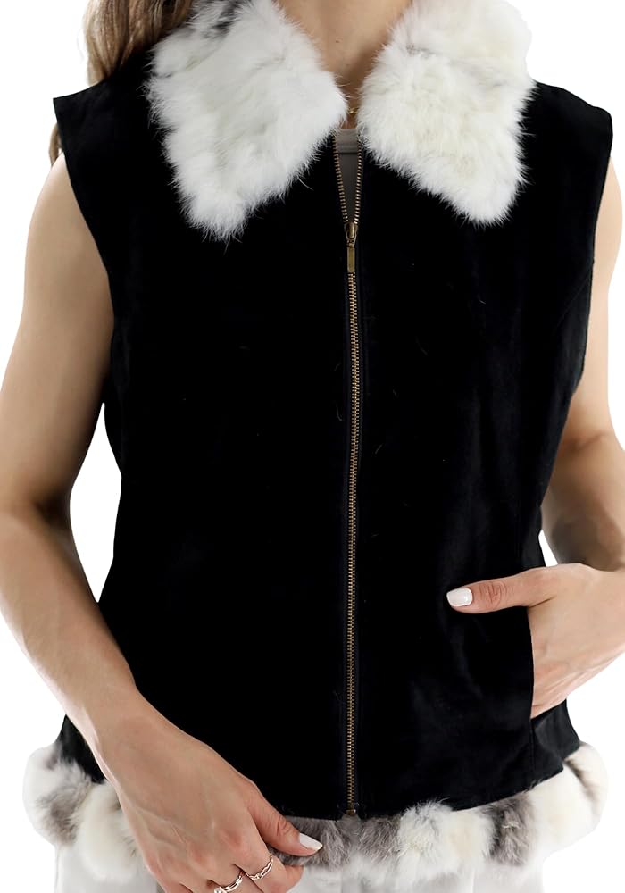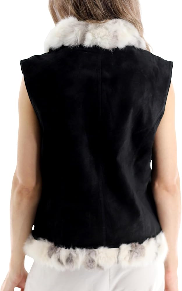 Sleek and stylish: This black suede leather vest with fur trim exudes a sleek and stylish look, perfect for enhancing your outfit.
