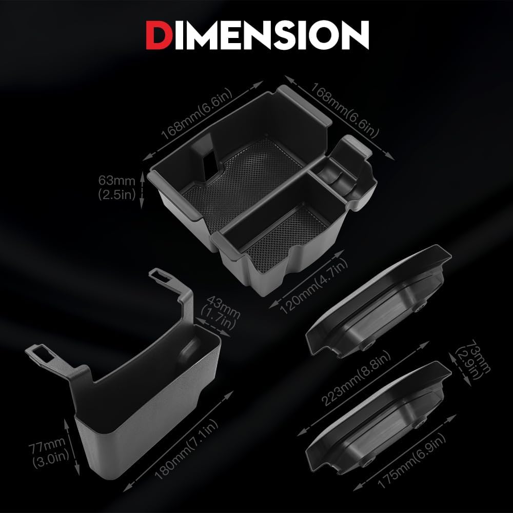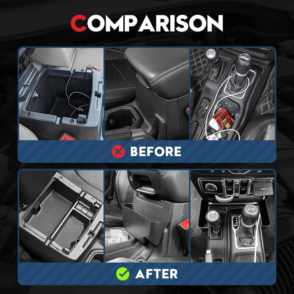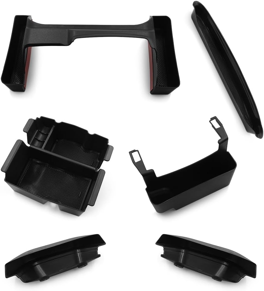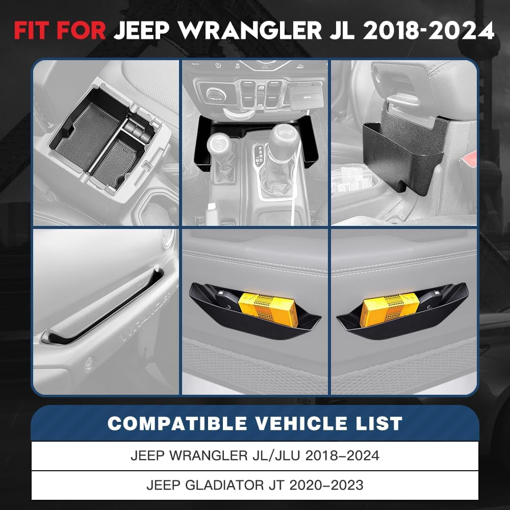 Automotive accessories organizer kit contains 1 piece armrest inside tray, 1 piece armrest rear box, 1 piece gear shift side storage box, 1 piece co-pilot dash grab handle box and 2 pieces door grab handle boxes. They're specially engineered to fit for Jeep Wrangler JL/JLU 2/4-door Unlimited 2024 2023 2022 2021 2020 2019 2018 and Gladiator JT 2023 2022 2021 2020.