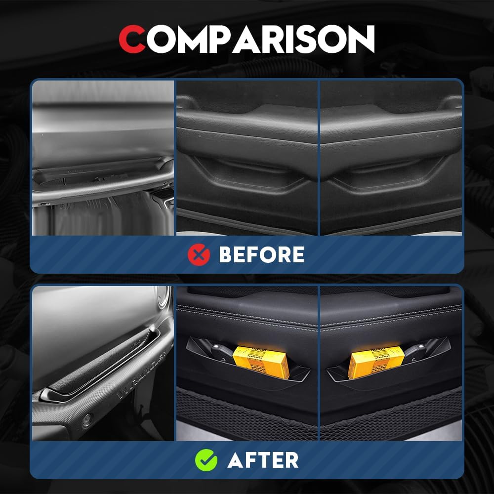 Quick and easy install. Vehicle specific organizers can perfectly insert into your offroad truck interior center console without any big modification. Gear shift side storage box is covered with double-sided adhesive tapes for secure mounting. Simply peel off the surface films and it will stick firmly to the center console. Before installing side box, please clean the mounting environment.