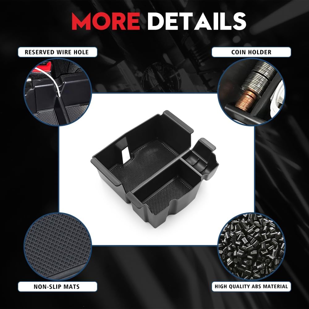 Armrest inside tray divides the middle arm rest storage box into upper and lower layers to make the space of deep center console more reasonable and usable. Besides, it features item-specific storage compartments, then you can better organize your phones, wallets, pens, sunglasses, business cards, coins, and more other stuff without cluttering up your car or truck.