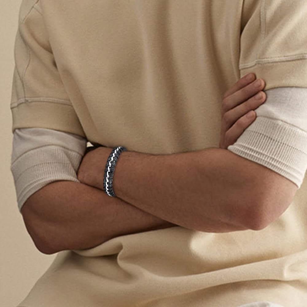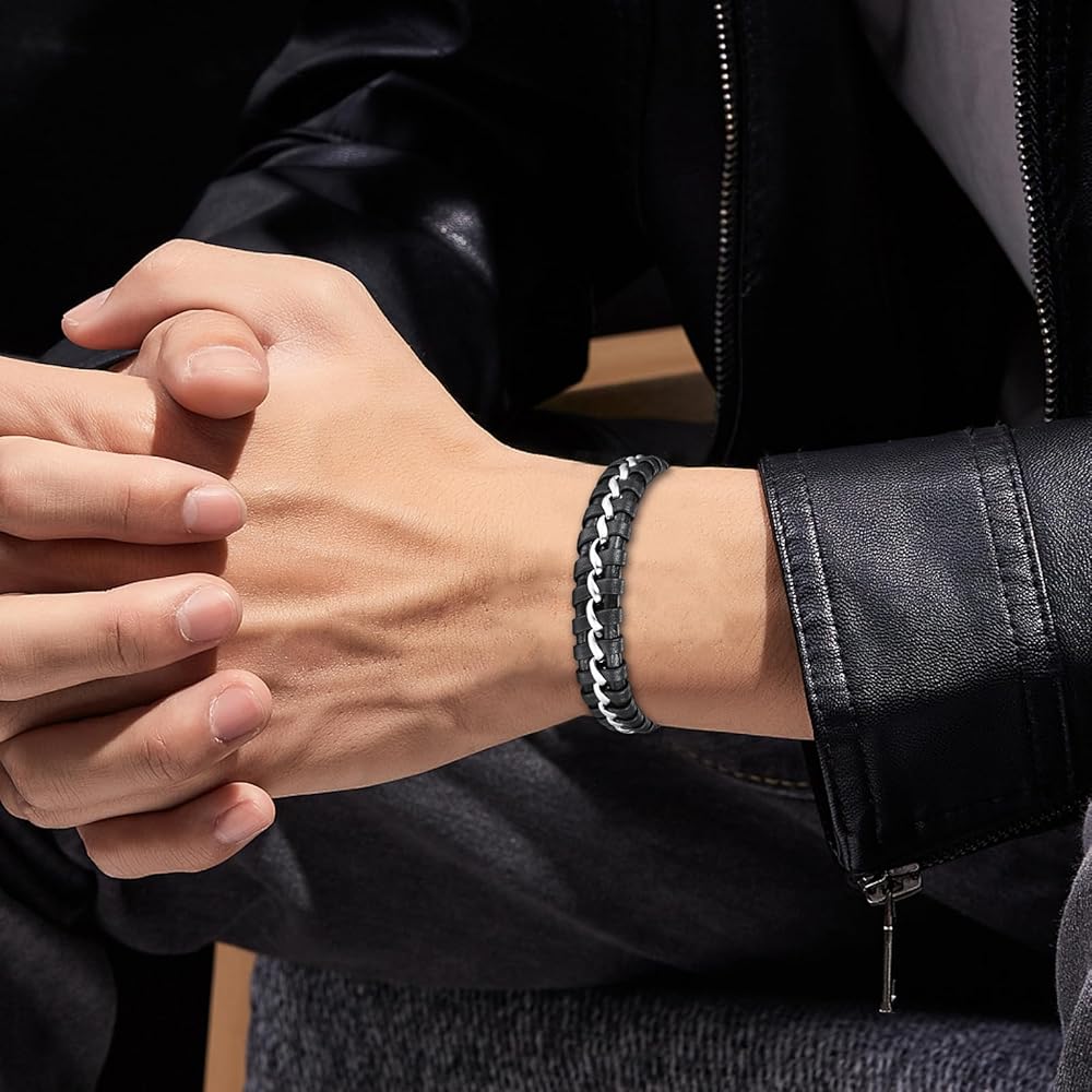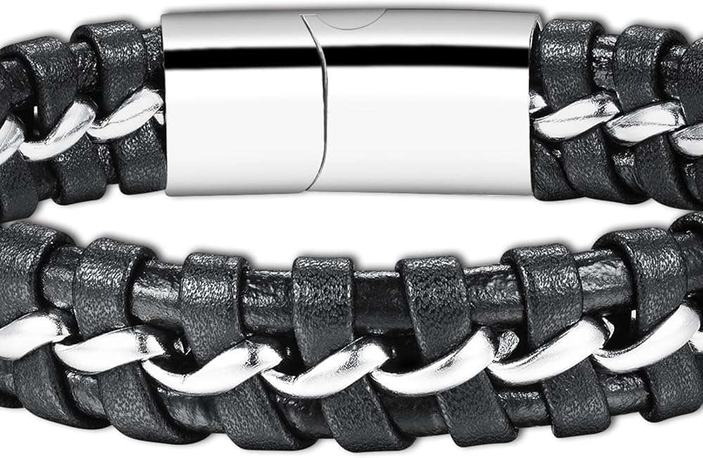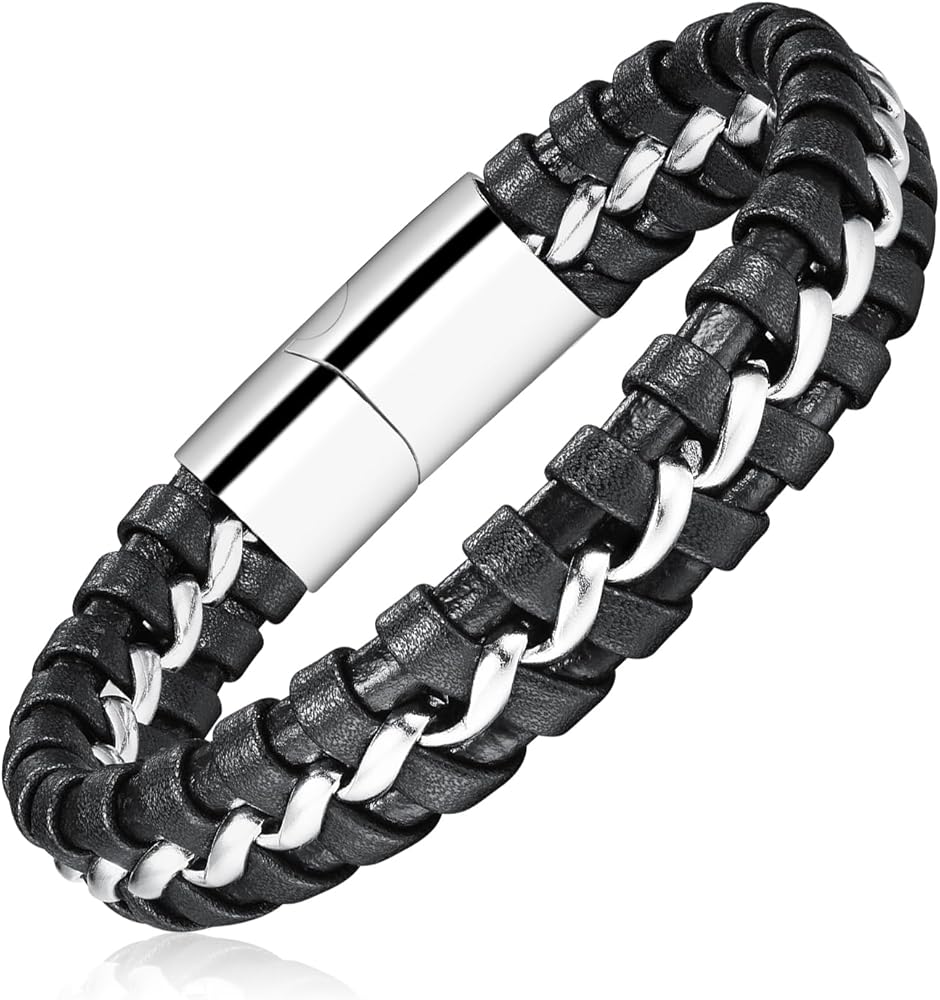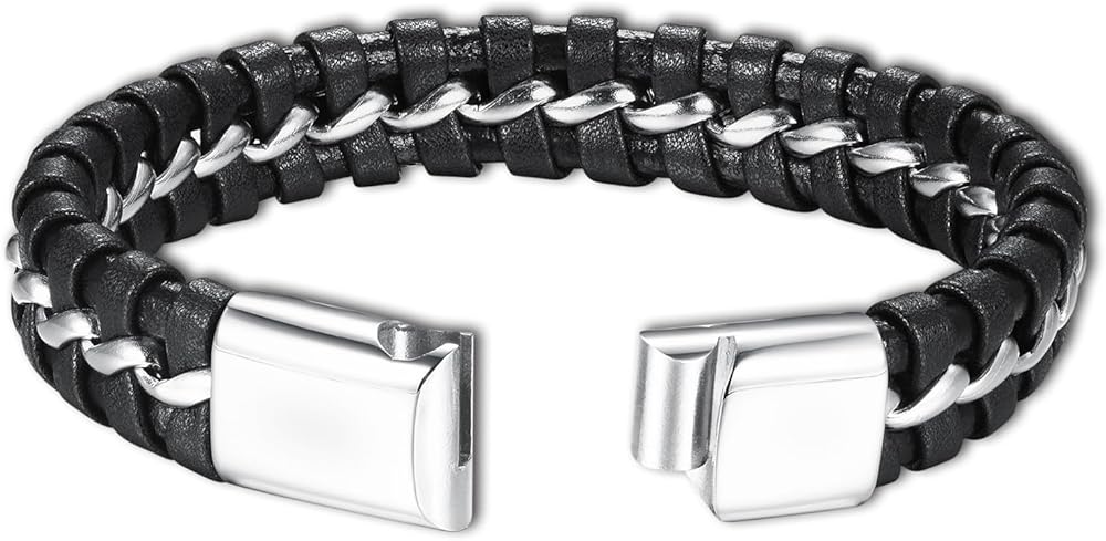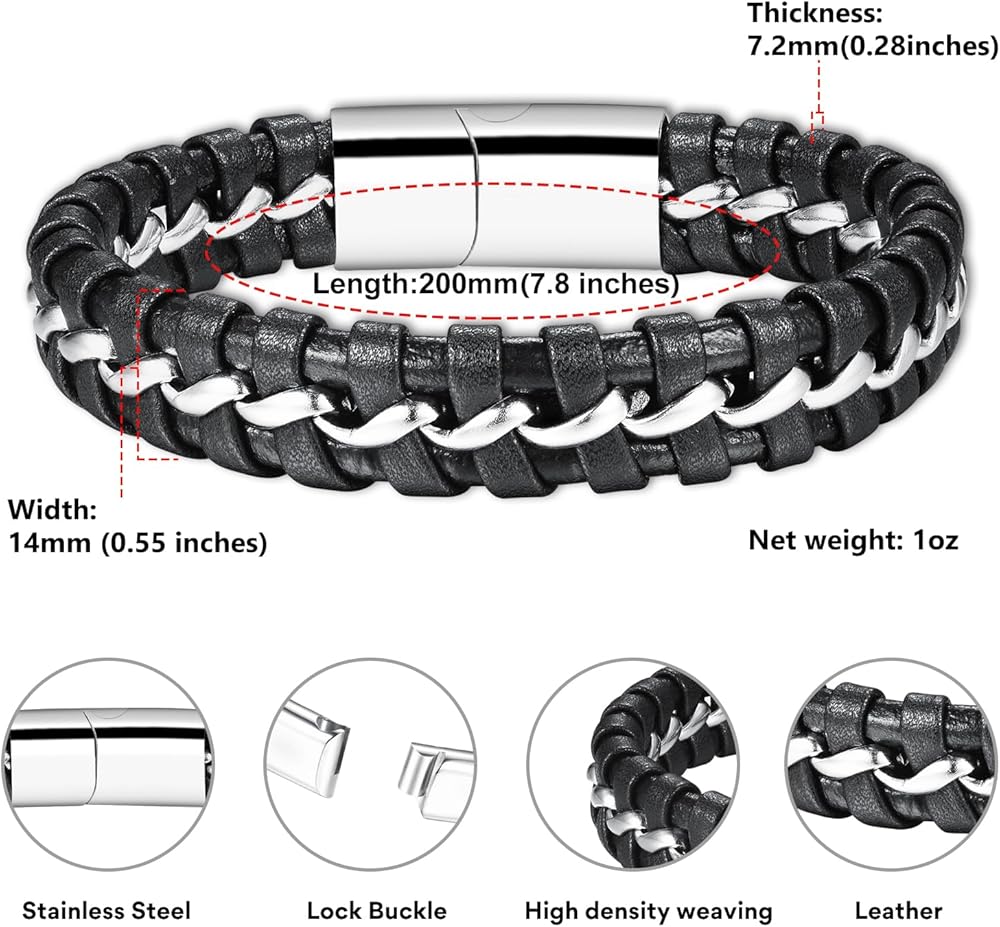 • 【Unique Design】:This bracelet, with stainless steel design, is very easy to put on and remove. Leather and stainless steel, high density weave, elegant and personalized. The middle circle of stainless steel weaving, play the role of embellishment and fixation, longer wearing life than ordinary leather bracelets.