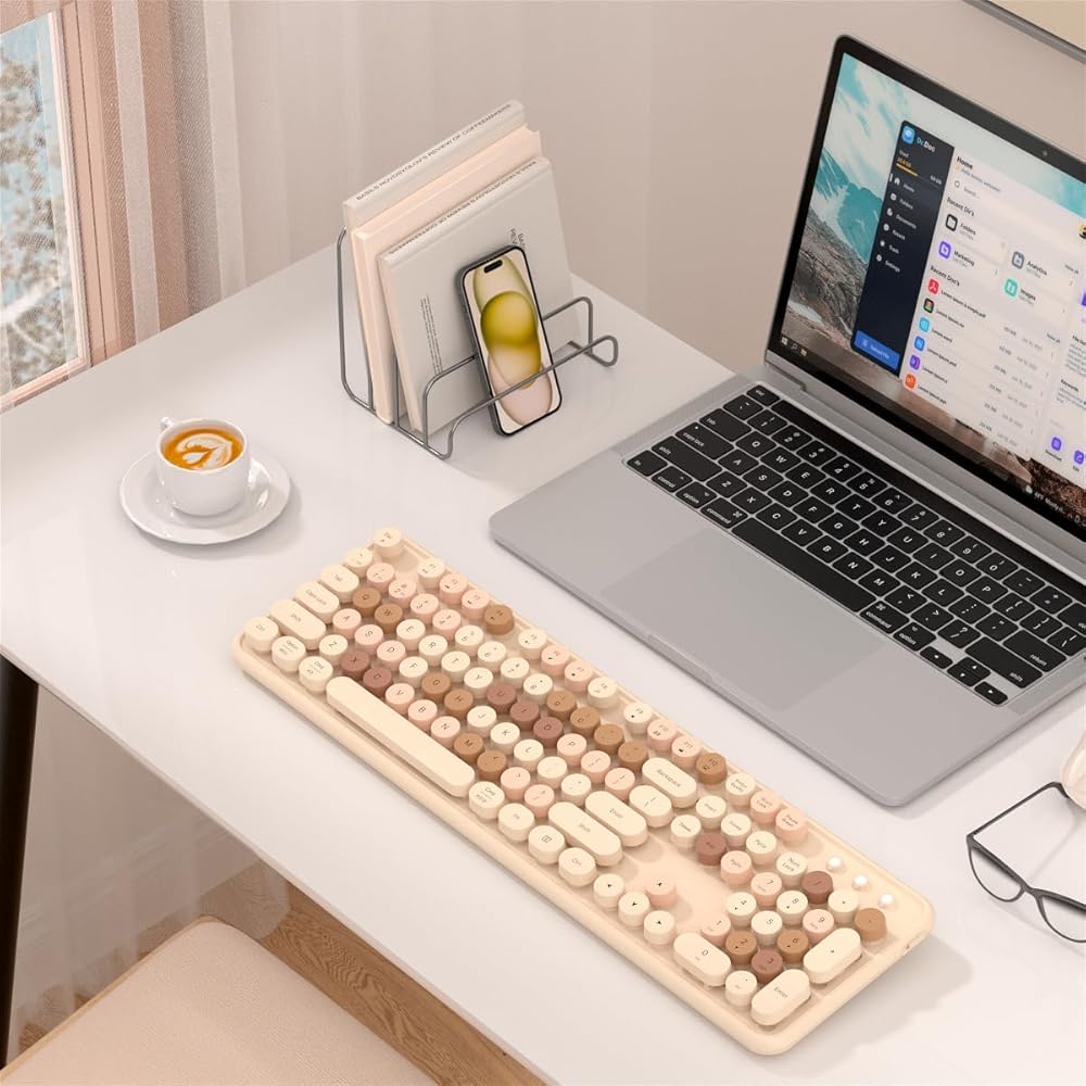 • تصميم قديم ملون: يتميز بأغطية مفاتيح مستديرة على طراز الآلة الكاتبة القديمة، وتصبح الكتابة نشاطًا مريحًا وممتعًا. لا تتميز لوحة المفاتيح الخاصة بنا بلون أنيق فحسب، ولكنها توفر أيضًا زوايا كتابة ممتازة. تم تصميم هذه الزوايا لضمان أقصى قدر من الراحة، مما يسمح لك بالعمل لفترات طويلة دون إجهاد.