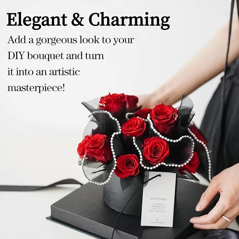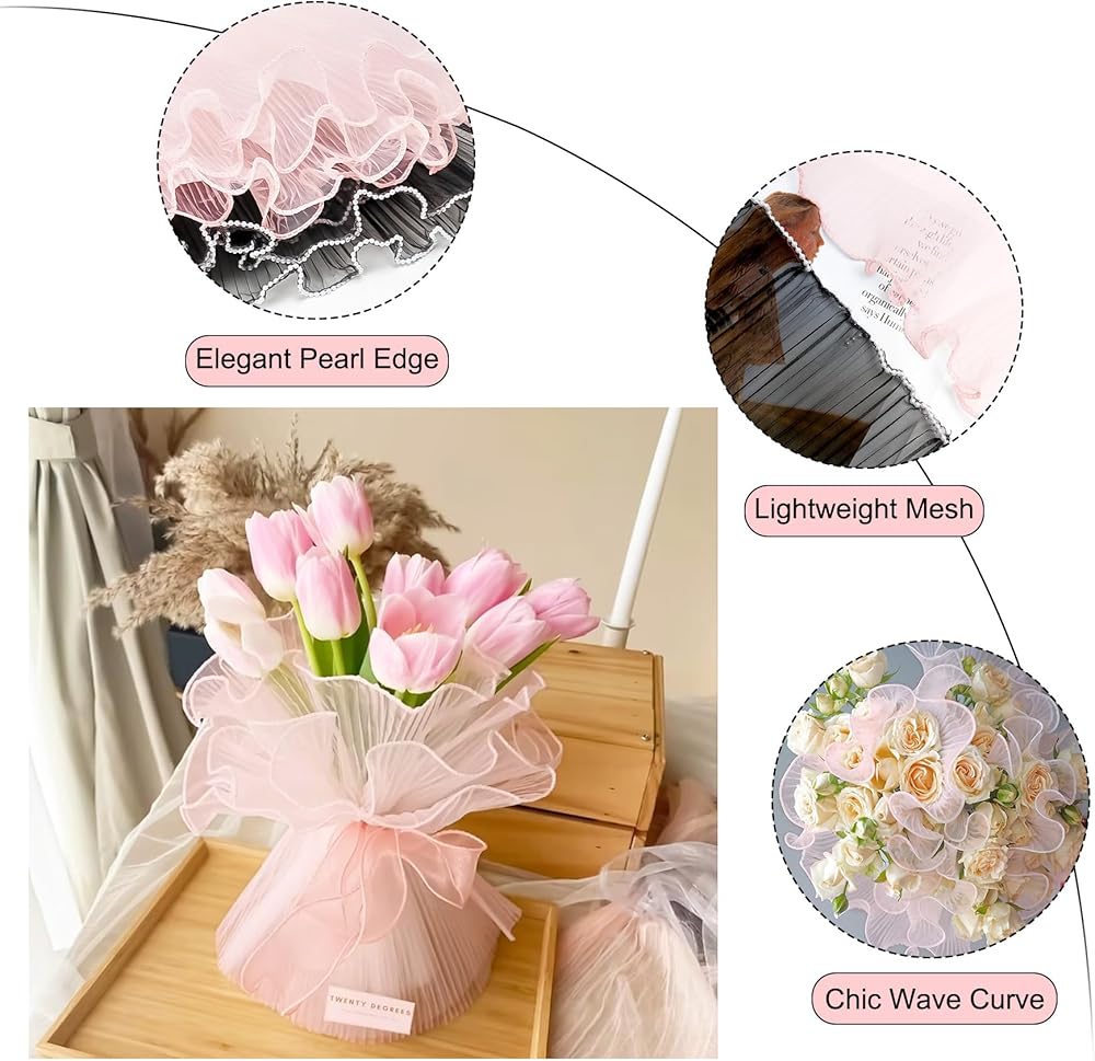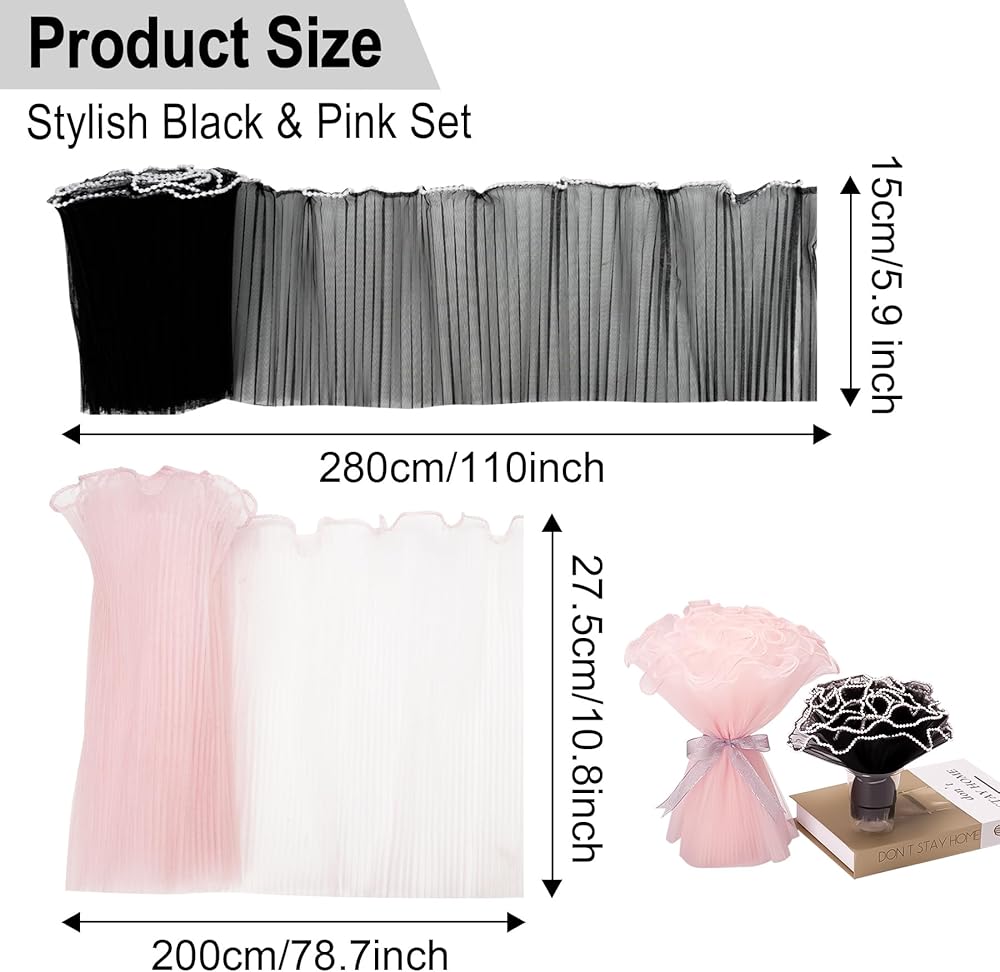 💐 “Stunning Packaging” - Our set includes two beautiful flower wrapping papers, designed to create captivating bouquets. It features a soft pink wave mesh paper (10.8-inch W x 78.7-inch L) and a chic pearl edge black flower paper (5.9-inch W x 110-inch L)