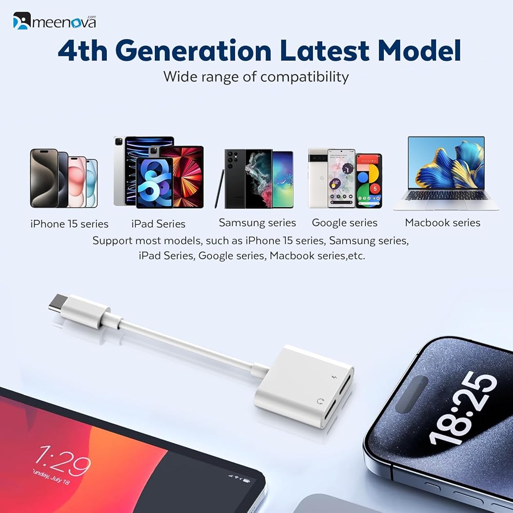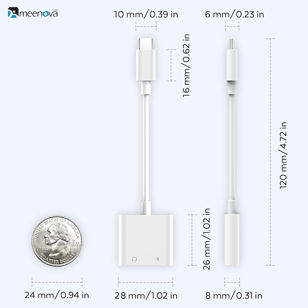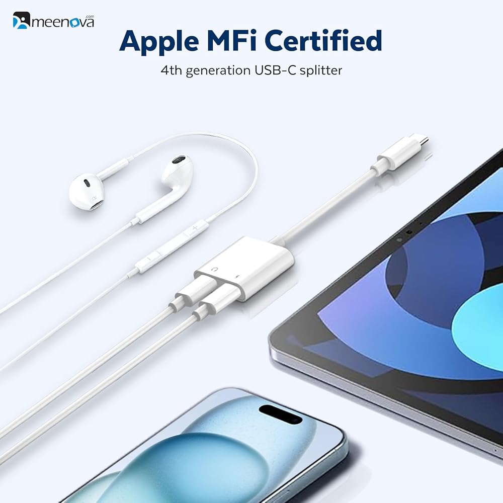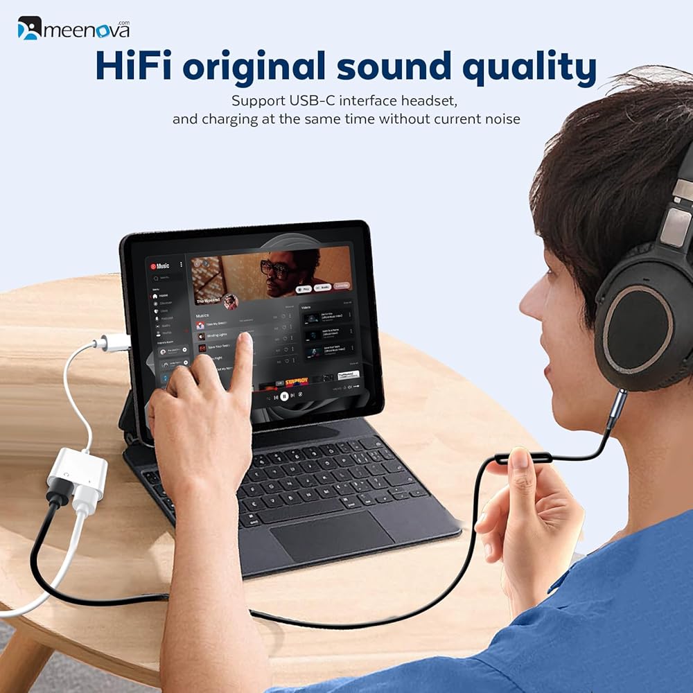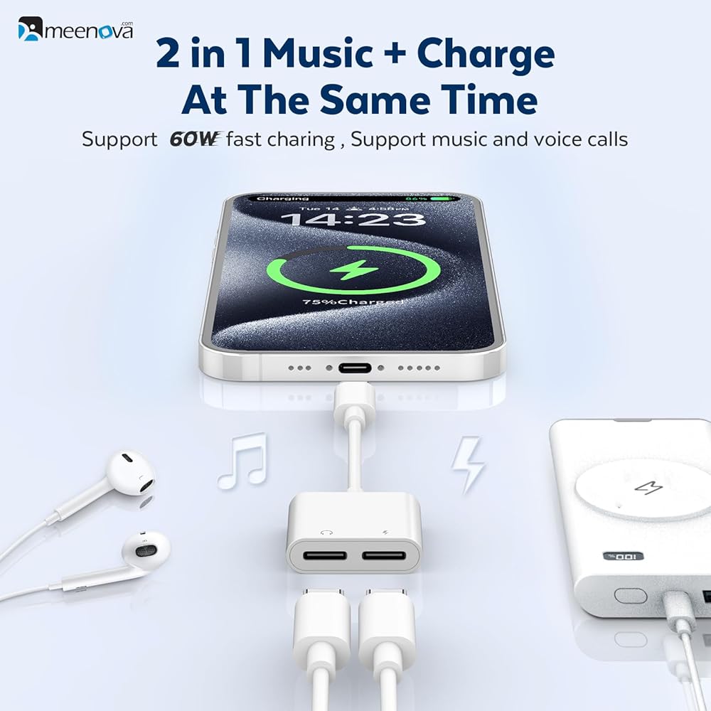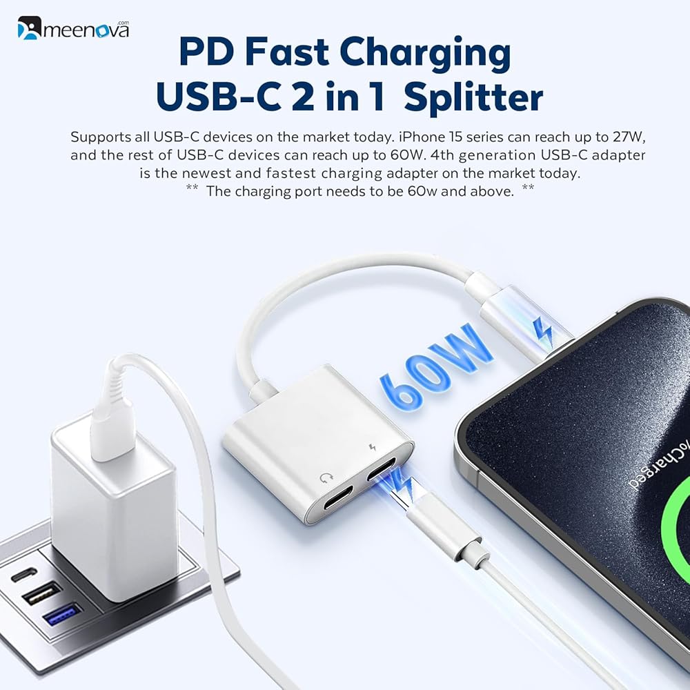 meenova USB C Splitter 1 in 2 Out، سماعة رأس USB C مزدوجة ومحول شاحن 60 وات، محول صوت من النوع C مع دونجل شحن سريع متوافق مع iPhone 15، Samsung Galaxy S23/S22/S21 Ultra iPad، Pixel