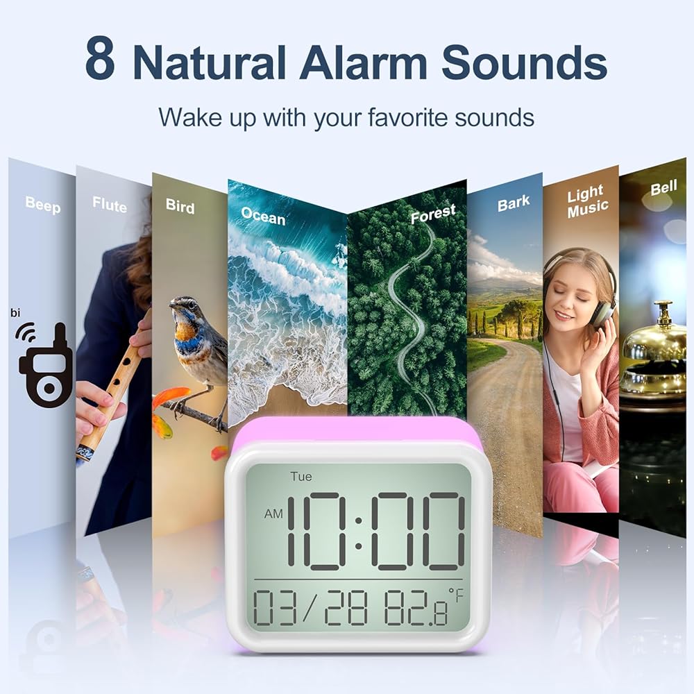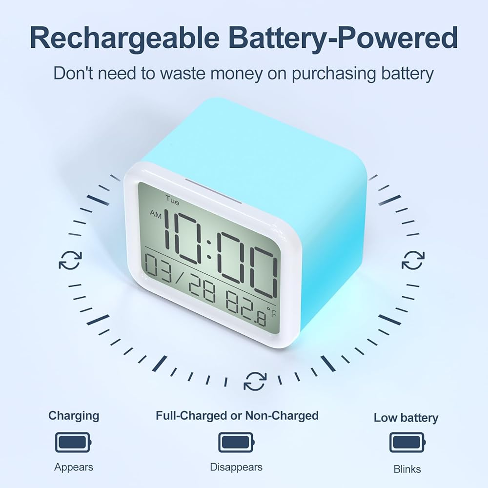 ساعة منبه ببطارية قابلة لإعادة الشحن من ريتشر مع ضوء ليلي بـ 7 ألوان، ساعة منبه صغيرة لغرفة النوم للأطفال، 8 أصوات منبه، ضوء ليلي 0-100% وخافت للساعة، حجم قابل للتعديل، درجة الحرارة، محمول