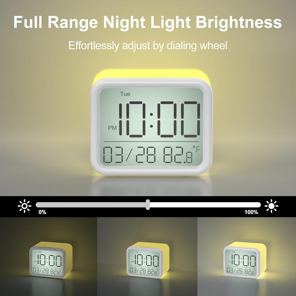 【خافت إضاءة خلفية 0-100% مع إضاءة مستمرة】توفر ساعة المنبه للأطفال البالغين نطاقًا كاملاً من سطوع الإضاءة الخلفية، ويمكن تعديل درجة السطوع التي تريدها بسهولة في الليل للحصول على بيئة نوم مريحة عن طريق تمرير شاشة العرض. تتيح لك الإضاءة الخلفية المضيئة باستمرار الحصول على تجربة قراءة سهلة في الليل دون الحاجة إلى التمرير مرة أخرى.