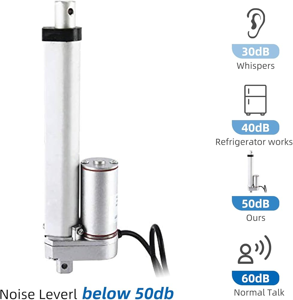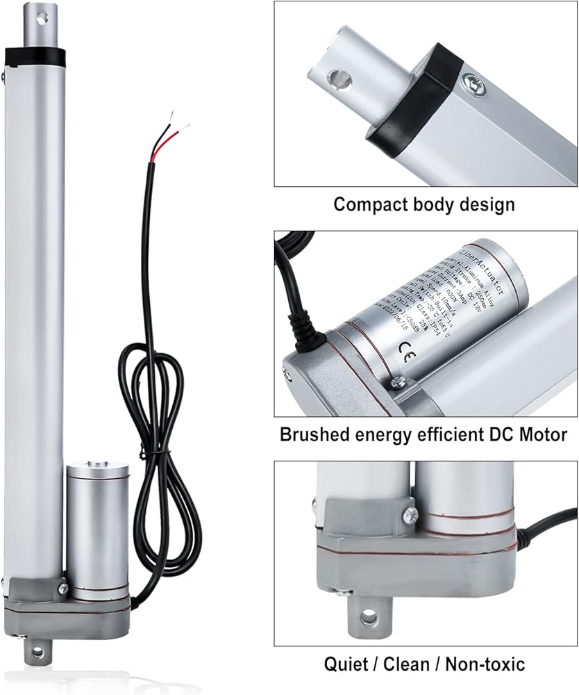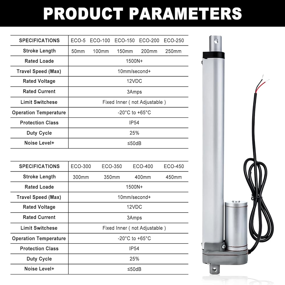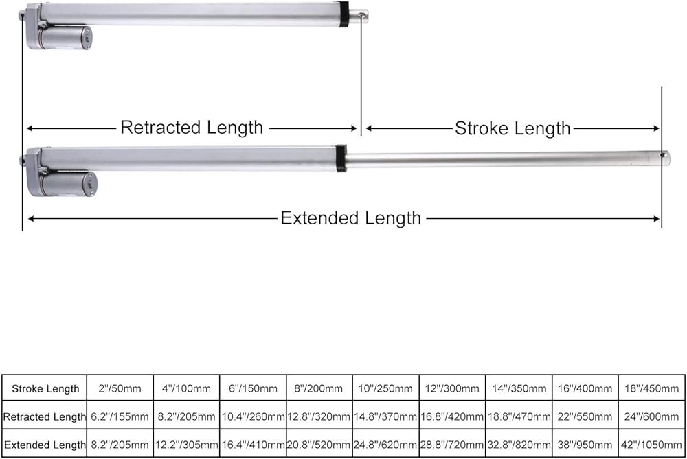 Specification: Color: Silver Material: Aluminum Alloy Input Voltage: DC 12V Rated Current: 3Amp Stroke length 250mm(10inch) Retracted length 370mm(14.8inch); Extended Length 620mm(24.8inch) Rated Load: 900N Travel Speed: 10mm/s Limit Switch: Built-in Working Temperature: -20ºC to 65ºC Protection Class: IP54 Duty Circle: 25Percent Noise Level: How To Install 1. Prepare to connect the two wires of the actuator to a 12 volt battery 2.Blue wire to the positive terminal and grey wire to negative terminal will make the actuator extend. To make it retract, just reverse the terminal connections.3.To simplify the last step, you can prepare a reverse polarity relay or switch (not included) for the actuator. When you want the actuator to extend and retract, just press the switch 4. Your actuator will hold its position when the power is off. It will automatically stop when reaches the end.5.The actuator has pre-installed inner limit switch, it cannot be adjustable. 6. It comes with mounting brackets. Warm Notice: 1. Please use the 12V DC power adapter 2. Please do not exceed the rated load3. All the actuators have duty cycle, they are unable to work all the time without stop. The duty cycle of this actuator is 20Percent. it means that your actuator needs 4 minutes to rest for every 1 minute of work. If the actuator keeps working for long time, the motor is easily burnt out. 4. Please be careful, the actuator not completely waterproof Widly Use: Furniture and home application Hospitals and healthcareIndustrial and construction application Agricultural machinery Package Included: 1 X 10inch Linear Actuator 2 X Mounting Bracket 1 X Screw Set