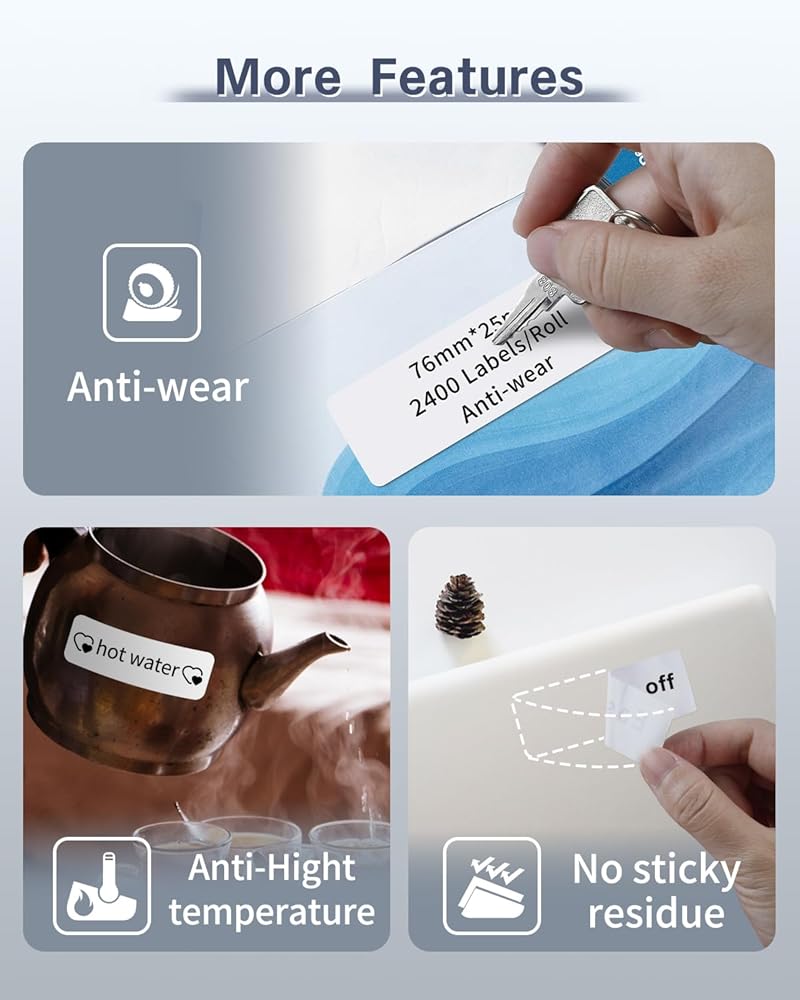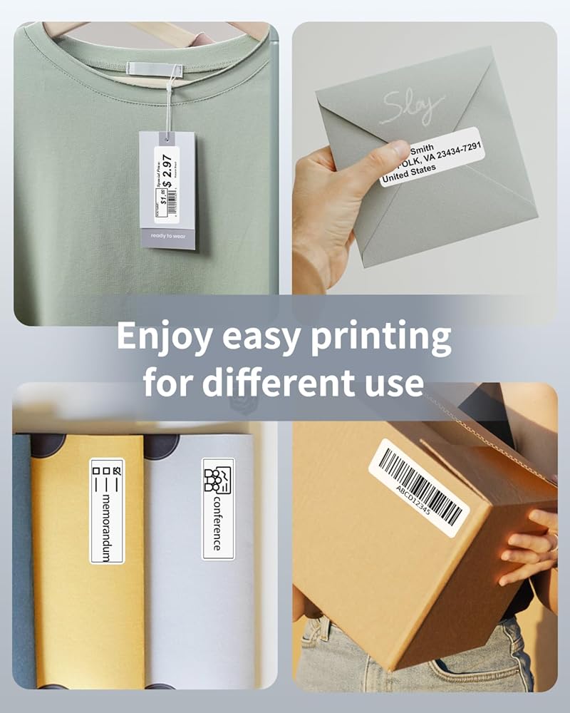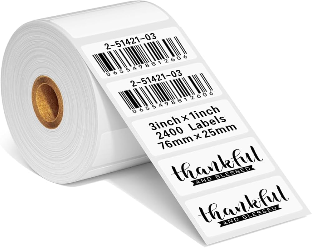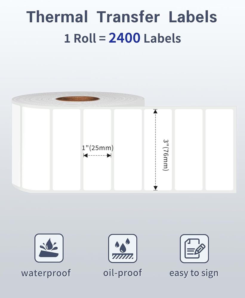 This is a high quality thermal transfer label paper for most thermal transfer label printers. Each label measures 3" x 1" (76mm*25mm) with a 1" core, and there are 2400 labels per roll. The labels are designed with black lettering on a white background for a clean look. These label sheets have excellent self-adhesive properties, allowing them to stick securely to a variety of surfaces. They are also oil-resistant, colorfast and writable, making the labels long-lasting and easy to record the required information. These label papers can withstand extreme temperatures, maintaining their quality from -65°F (-54°C) to 200°F (93°C). In addition, they are resistant to smears, scratches and chemicals, ensuring that labels are always legible. This label paper is carefully designed and manufactured to have a shelf life of more than 10 years, providing you with a reliable experience. These labels have a wide range of applications and are great for all types of labeling needs. You can use them as name tags, thank you stickers, branding, Diy designs, QR code printer labels, sorting labels, size labels, lab number labels, and shoe bag and clothing sorting among other scenarios. Whether it's for home use or commercial needs, these labels will meet your every marking and organizational need. Compatible with all thermal transfer printers, you can easily pair them with your existing equipment. Please note that this label can only be used on thermal transfer printers, make sure your printing device is compliant. When you buy our thermal transfer label paper, you get high-quality printing results, a wide range of application scenarios and compatibility with leading printers. Let these label papers help you improve your work efficiency and manage your affairs more conveniently!