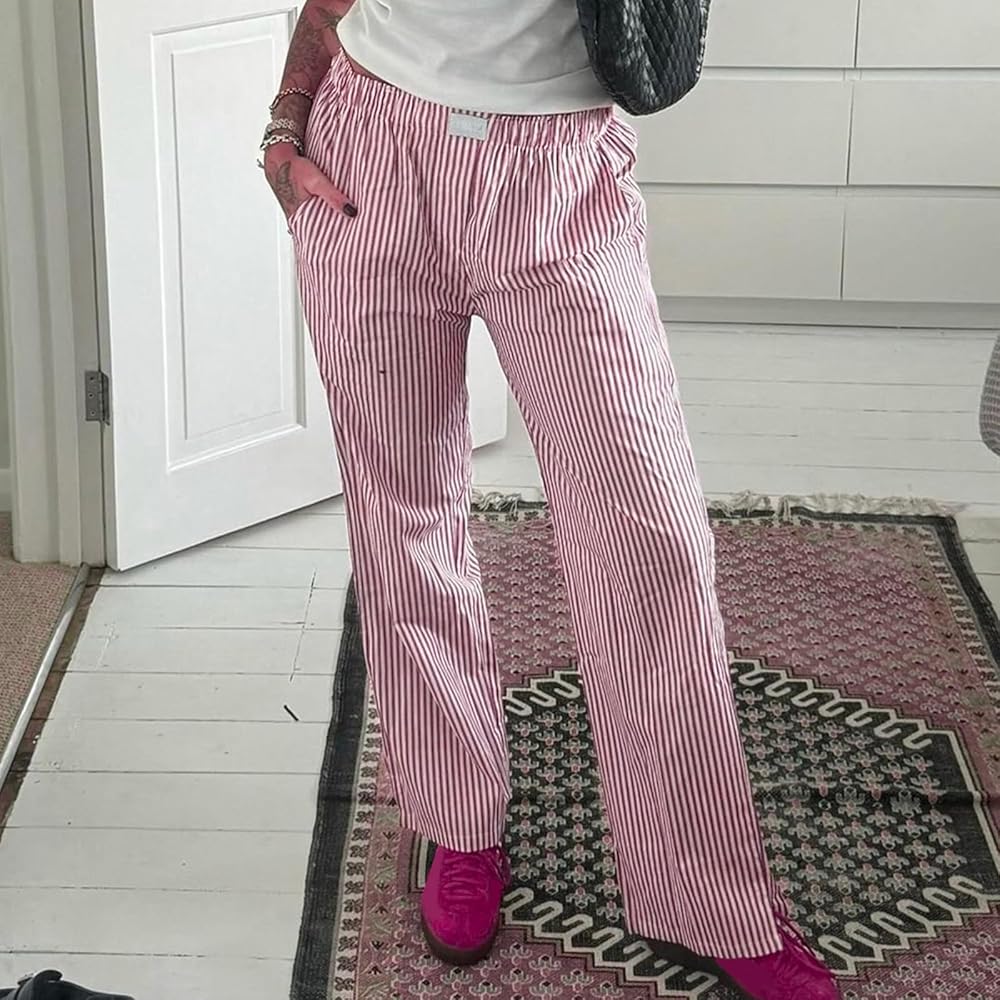 Women Y2k Stripe Print Long Pants Casual Loose Fit Elastic Waist Wide Leg Pants with Pockets Lounge Pants Streetwear