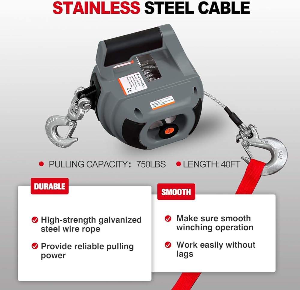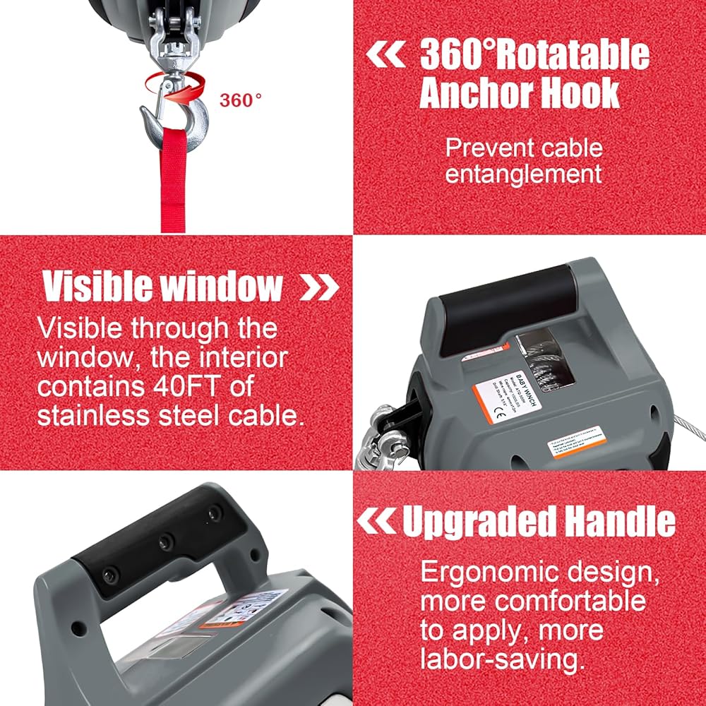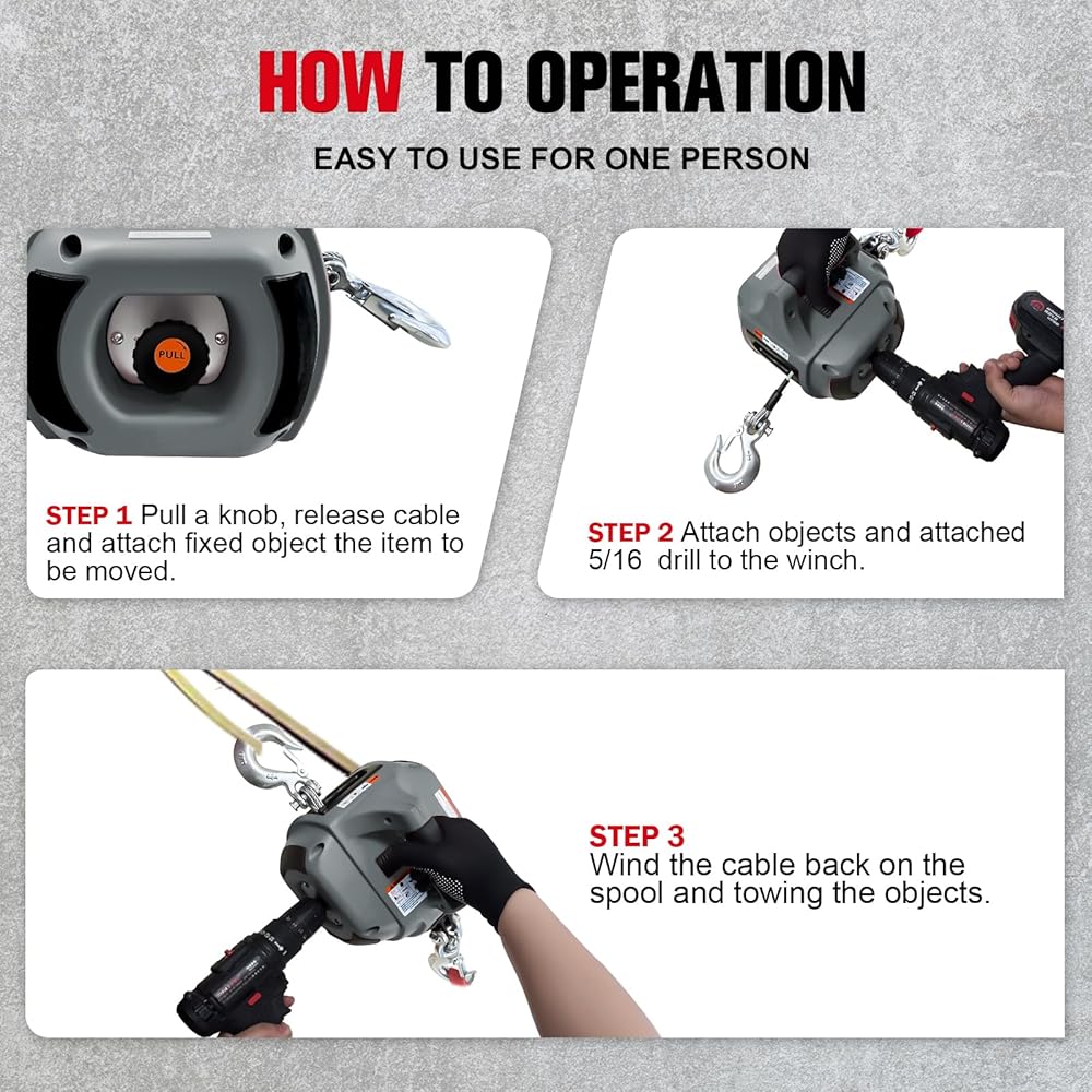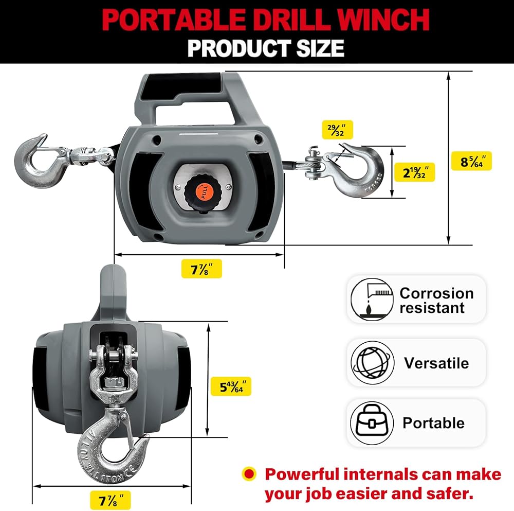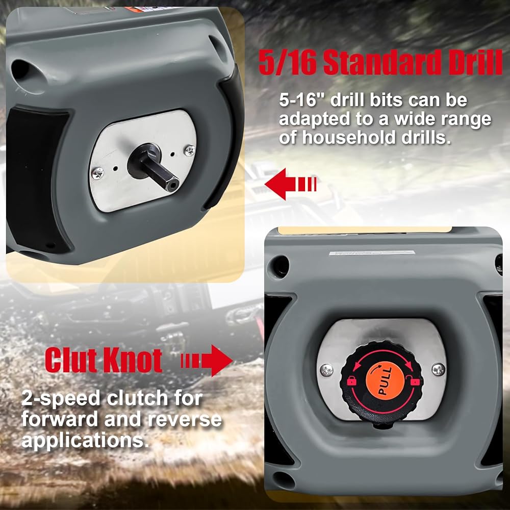 • 【سحب قوي】: رافعة المثقاب مدعومة بمثقاب قياسي 5/16 (غير متضمن)، سعة السحب القصوى: 1000 رطل. كابل من الفولاذ المقاوم للصدأ بطول 40 قدمًا، يوفر الجر الرأسي والأفقي قوة سحب موثوقة لضمان تشغيل الونش بسلاسة.