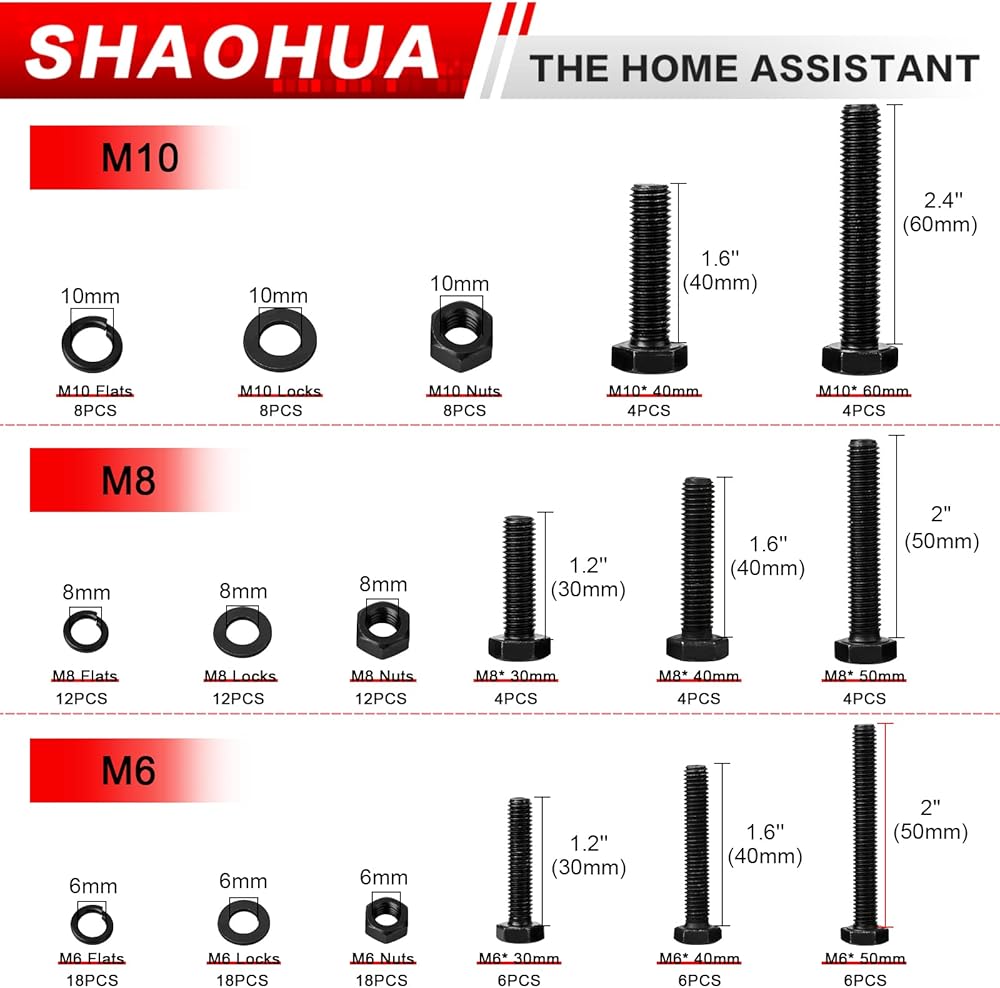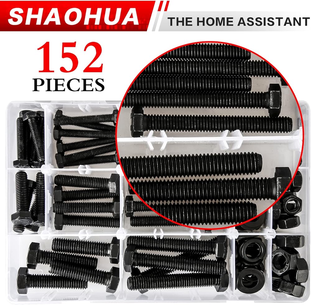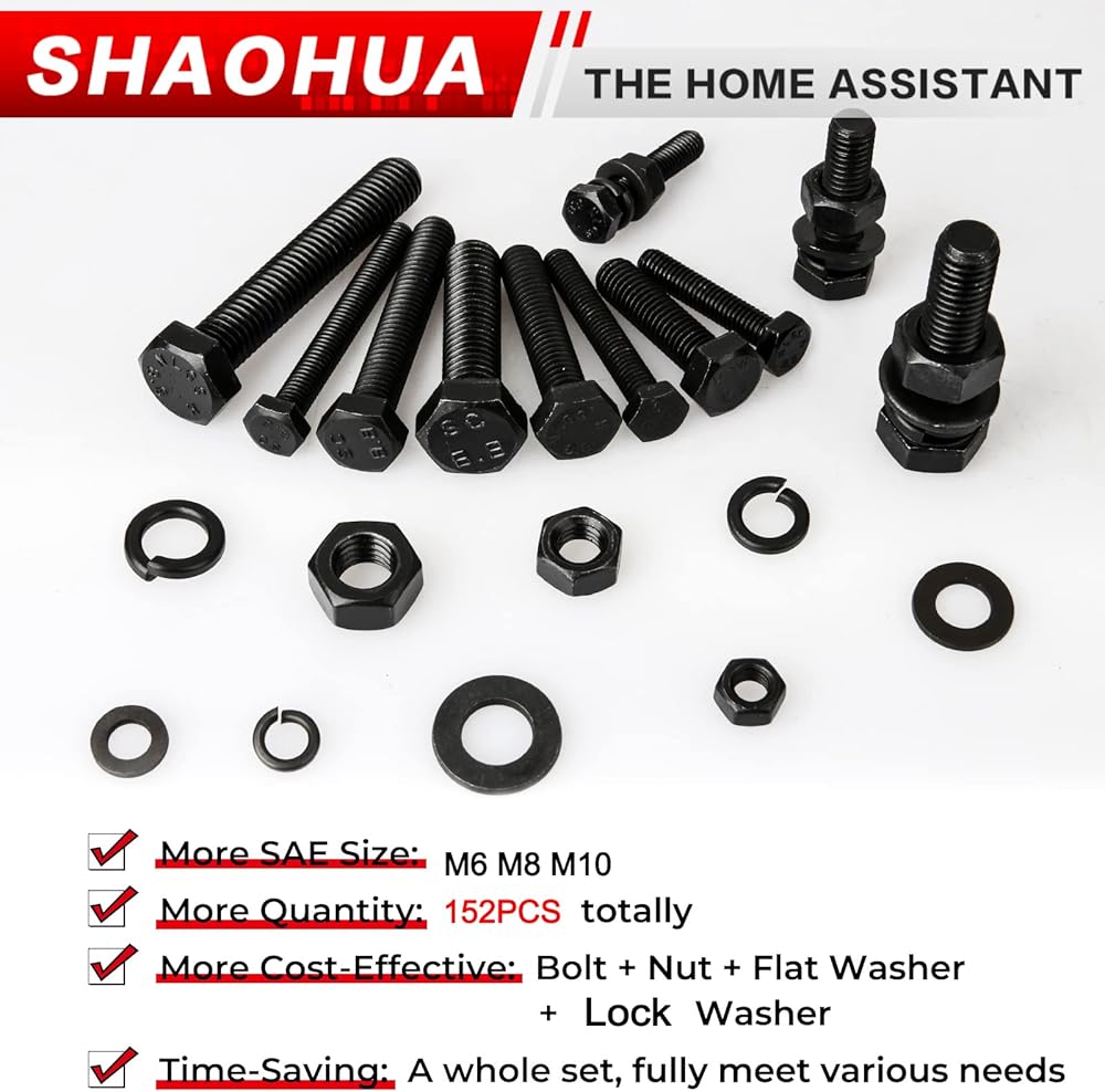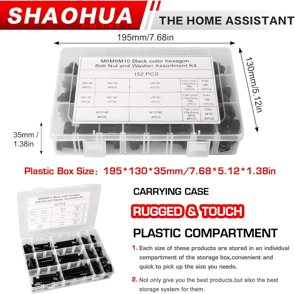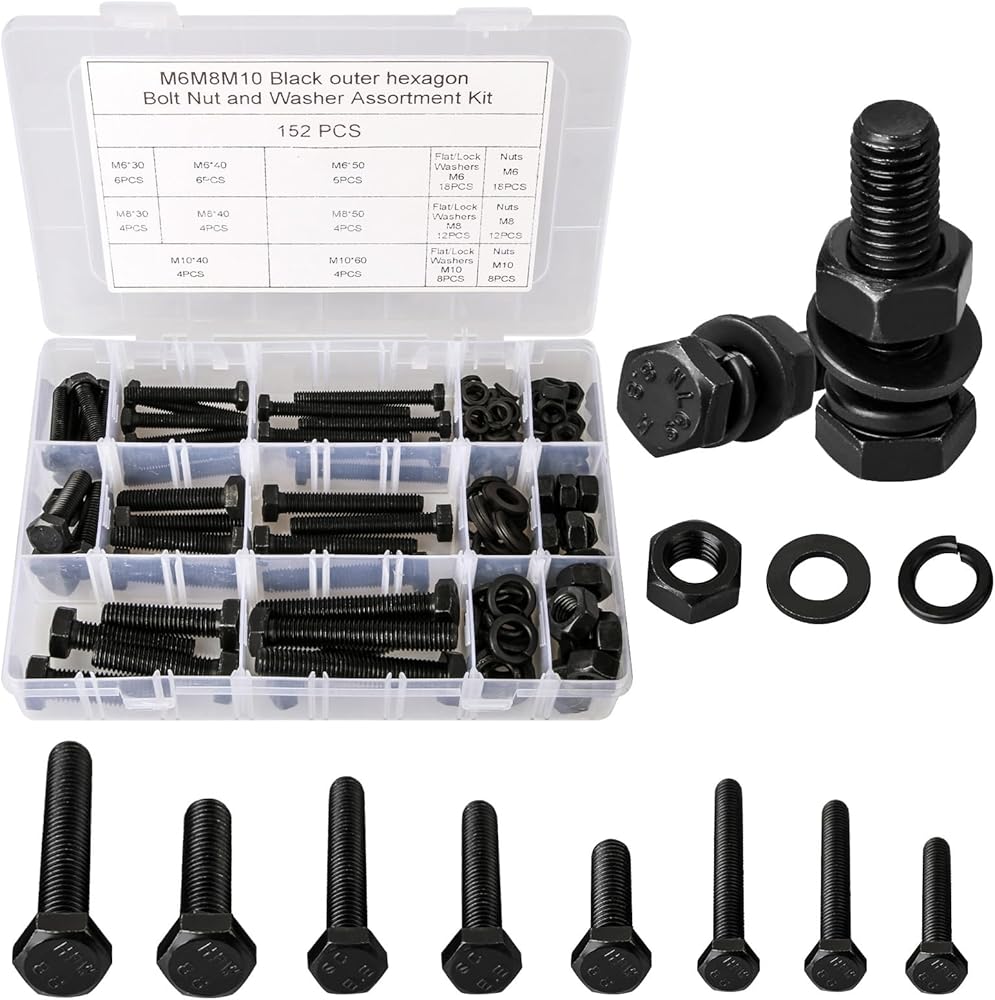 تشكيلة مسامير مترية، 152 قطعة M6 M8 M10 مجموعة متنوعة من الصواميل والمسامير، 8.8 براغي سداسية الرأس من الفولاذ الكربوني، مجموعة مسامير وصواميل قفل، مجموعة غسالات الحشية المسطحة تتضمن 8 أحجام شائعة