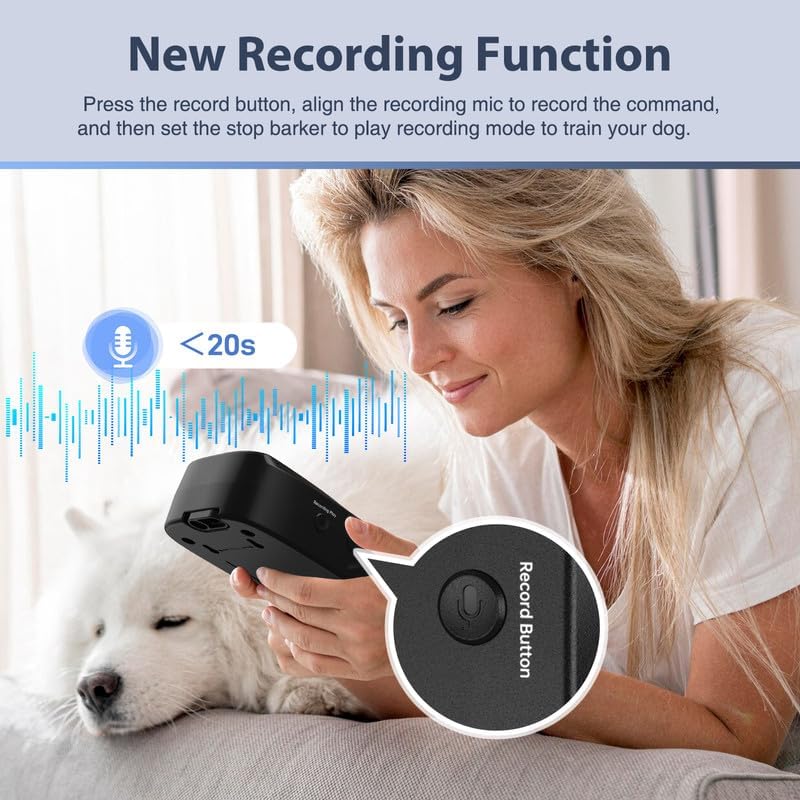 • 🐕Barking Control Device With 3 Functions--This bark stopper has 3 adjustable functions, emitting ultrasonic waves, recording and warning. There are also three corresponding buttons on the remote control: sending signals to the bark control device, playing recordings and warning reminders. This set of products can use a remote control to control the barking device, so the owner can safely train the dog even if he is not around the dog!
