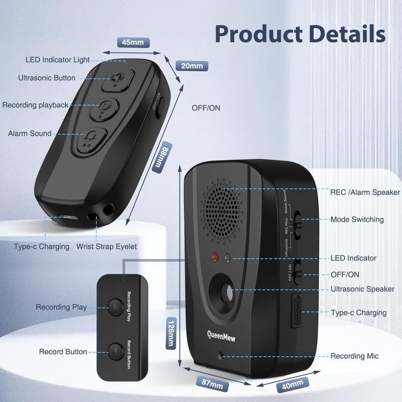 🕹️3 functions are adjustable: transmitting signals/emitting ultrasonic waves, playing recordings, warnings and reminders.