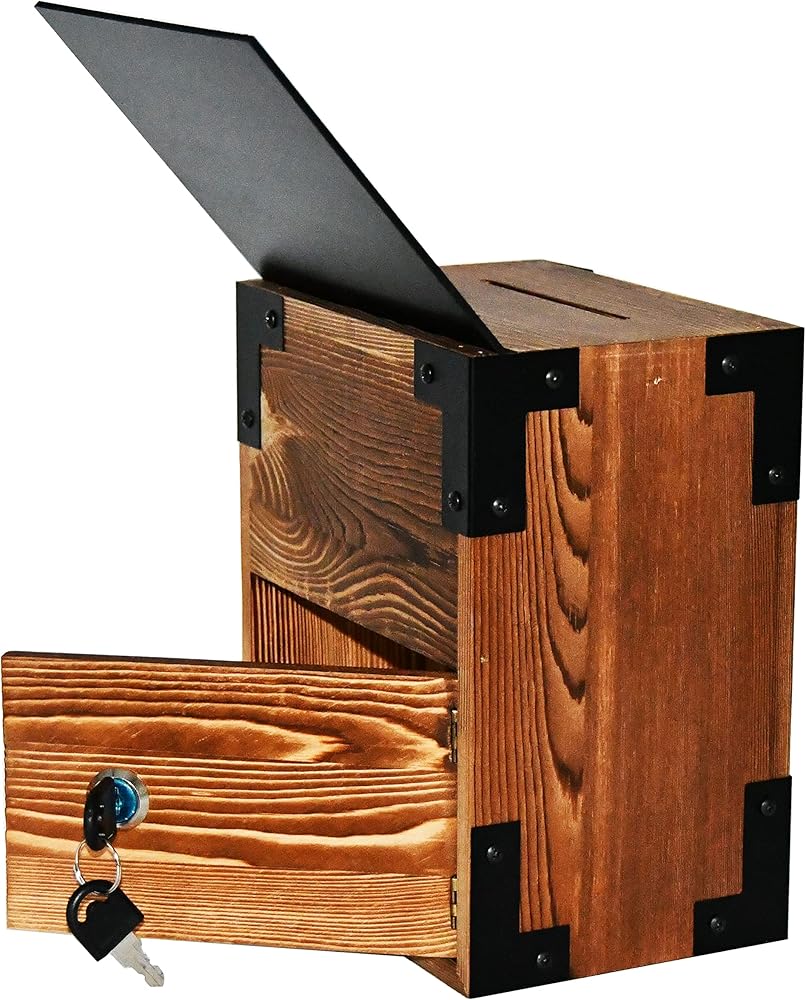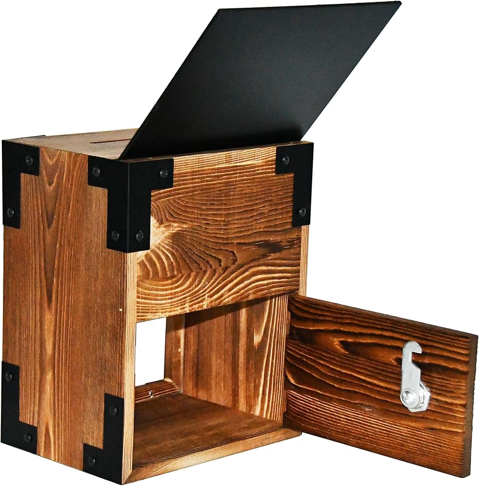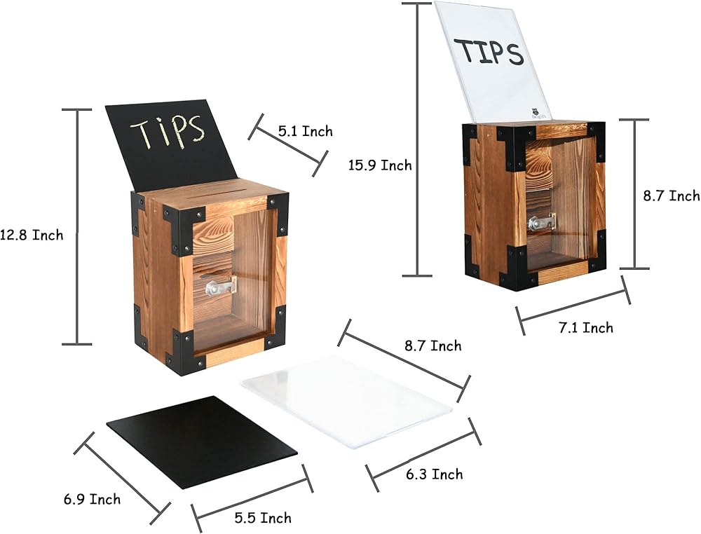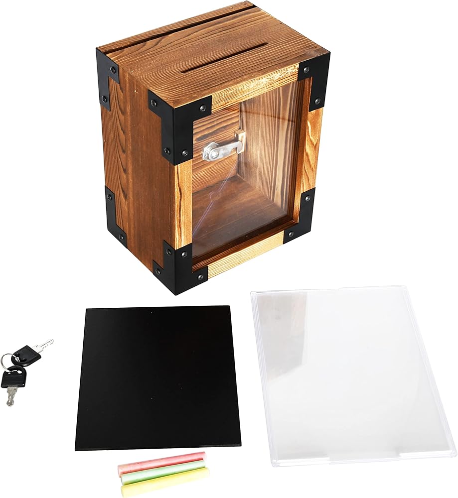 【هيكل متين】: صندوق الاقتراحات هذا المزود بقفل مصنوع من الخشب السميك بمظهر ريفي. لوحة الأكريليك الأمامية تجعل من السهل رؤية المحتويات بالداخل.