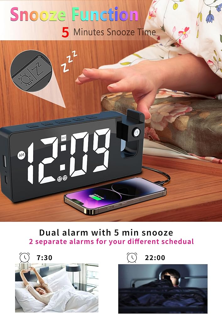 05/10) Dual alarms with 5 minutes snooze time ): The projection alarm clocks for bedrooms have 2 alarms that can meet different needs. The projector alarm clock for bedroom Snooze time is 5 minutes. a use-friendly projector clocks for the ceiling, a bedroom clock that projects time on ceiling.