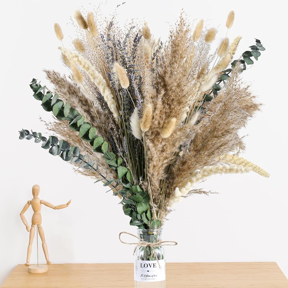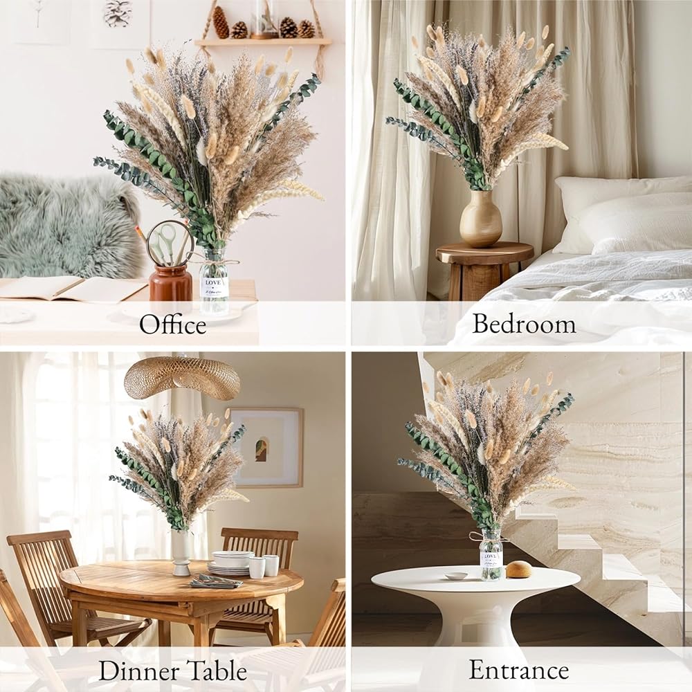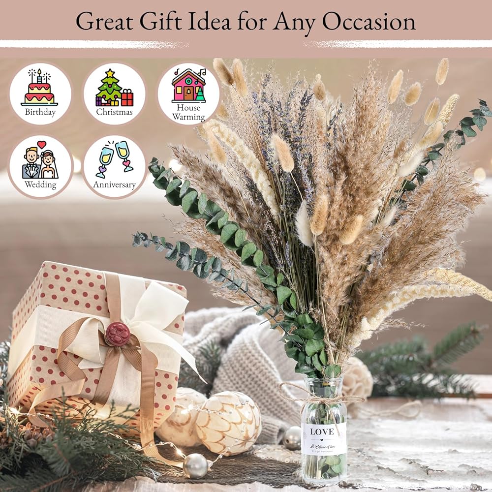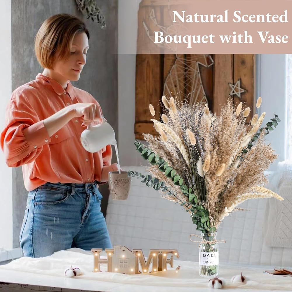 🏺ديكور منزلي مثالي مع مزهرية - ارفع أجواء مساحة المعيشة الخاصة بك دون عناء مع مجموعة باقة الزهور المجففة لدينا. لا حاجة للبحث عن مزهرية منفصلة؛ نقدم لك مزهرية زجاجية جميلة. ما عليك سوى وضع هذه الباقة الجميلة في أي ركن من أركان منزلك ومشاهدتها وهي تغير الجو. رائعة لديكور بوهو، وديكور غرفة النوم، وديكور غرفة المعيشة، وديكور المكتب، وديكور المكتب، وديكور طاولة القهوة، وديكور الرف