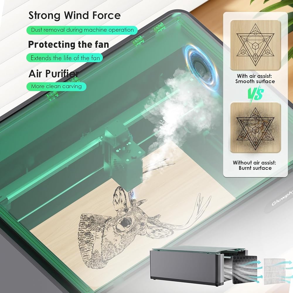 【نظام تصفية دخان مدمج وأنبوب نفخ، لا تلوث الهواء】: يمكن لعلبة نقش الليزر Gluwphy مع نظام تصفية الدخان المدمج تحقيق الترشيح الأولي للدخان والغبار، مما يمكن أن يقلل الدخان المفرغ بشكل كبير ويقلل من التلوث لحماية سلامتك، وفي الوقت نفسه، يمكنها حماية مروحة العادم بشكل أفضل وزيادة العمر الافتراضي للمروحة. ومعدات أنابيب النفخ المدمجة تحتوي على ملحق مضخة هواء مدمج، والذي يمكن أن يحقق تأثير قطع أفضل، ويوفر عناء الأسلاك والأنابيب، ويجعل نحتك أكثر وضوحًا دون ضبابية.