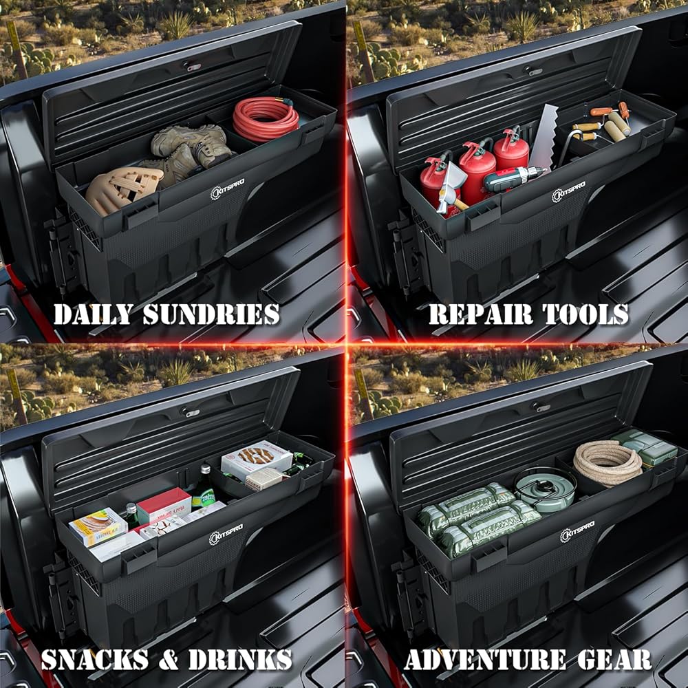 ✔【شديد التحمل】 صندوق أدوات سرير الشاحنة KitsPro يحمل ما يصل إلى 80 رطلاً من المعدات ويتميز بمساحة تخزين تبلغ 6.6 جالون/25 لتر. تساعد حقيبة التخزين القابلة للدوران على تخزين أدوات الصيانة الأساسية والقفازات الخارجية والمشروبات المعبأة في زجاجات والمزيد بسهولة.