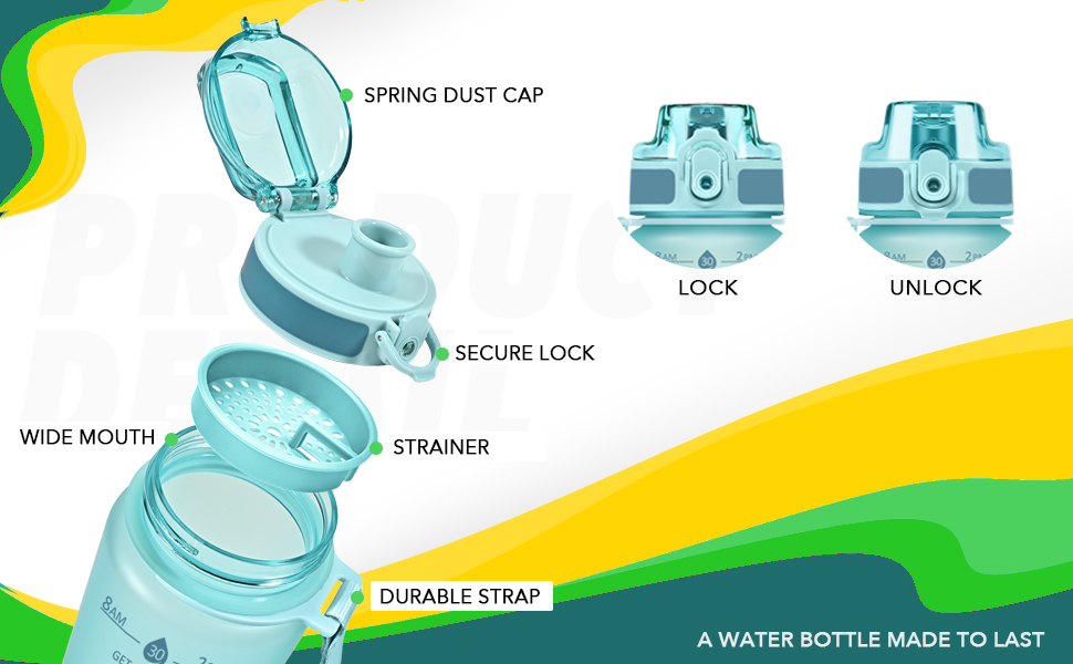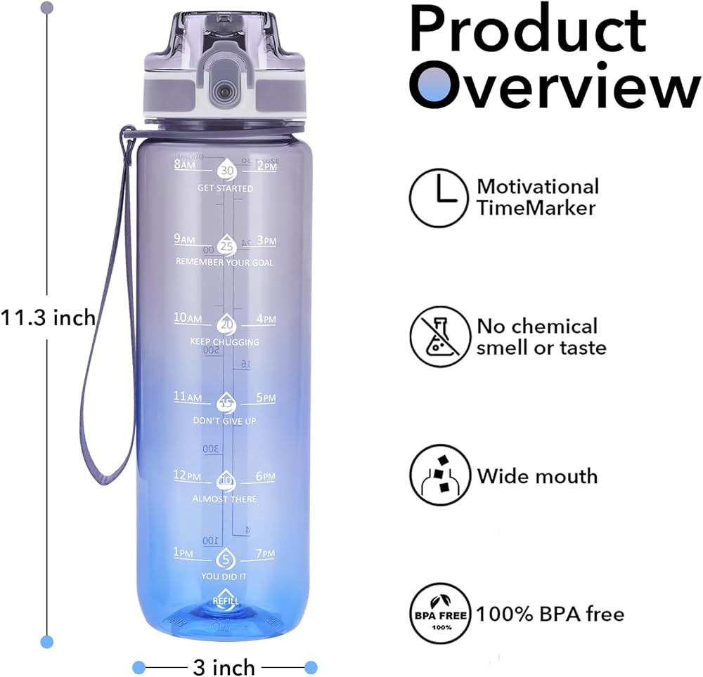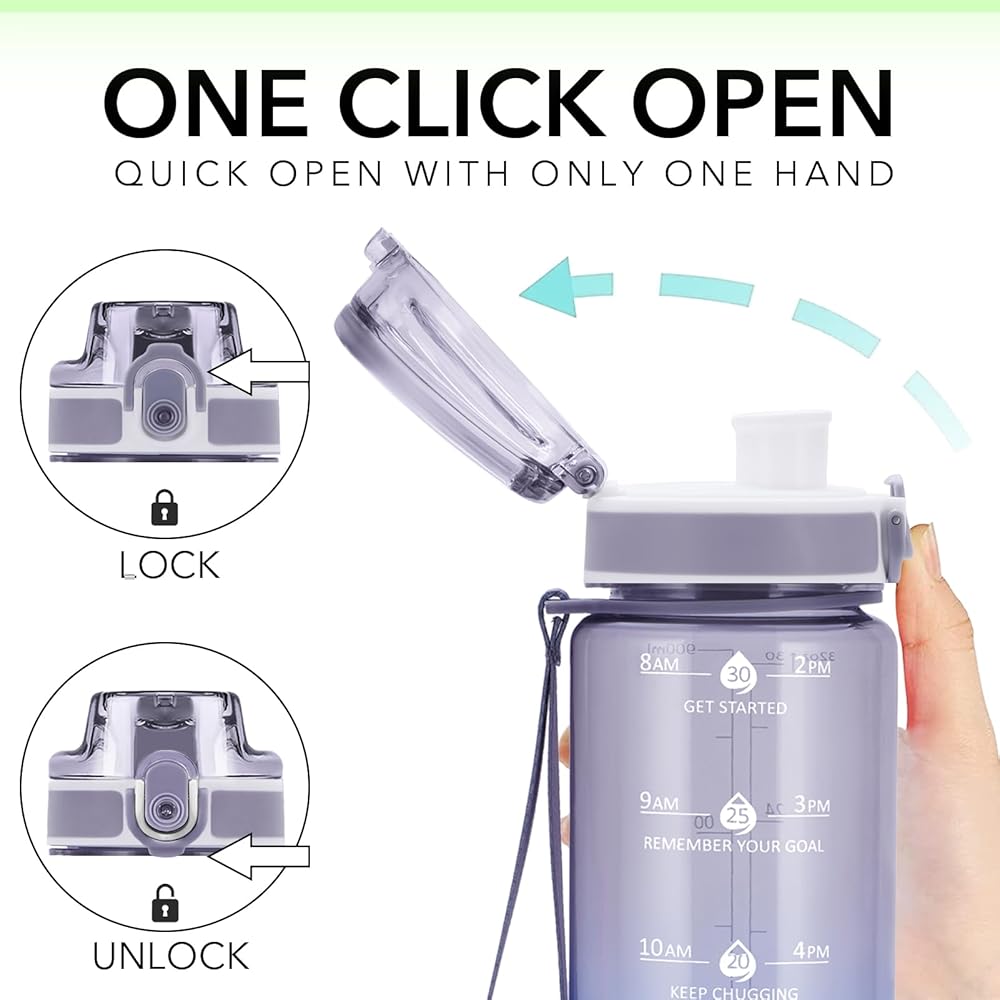 علامة الوقت التحفيزية: ابق على المسار الصحيح لتحقيق أهداف الترطيب الخاصة بك عن طريق اتباع علامات الوقت الموجودة على الزجاجة، والتي تذكرك بشرب الماء طوال اليوم.