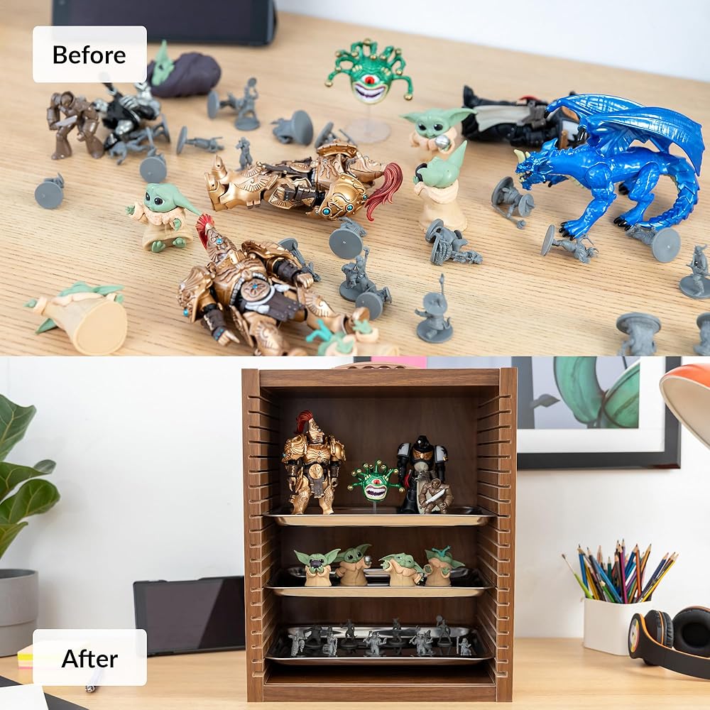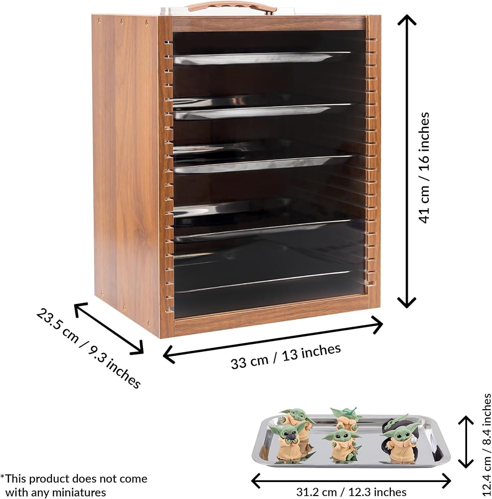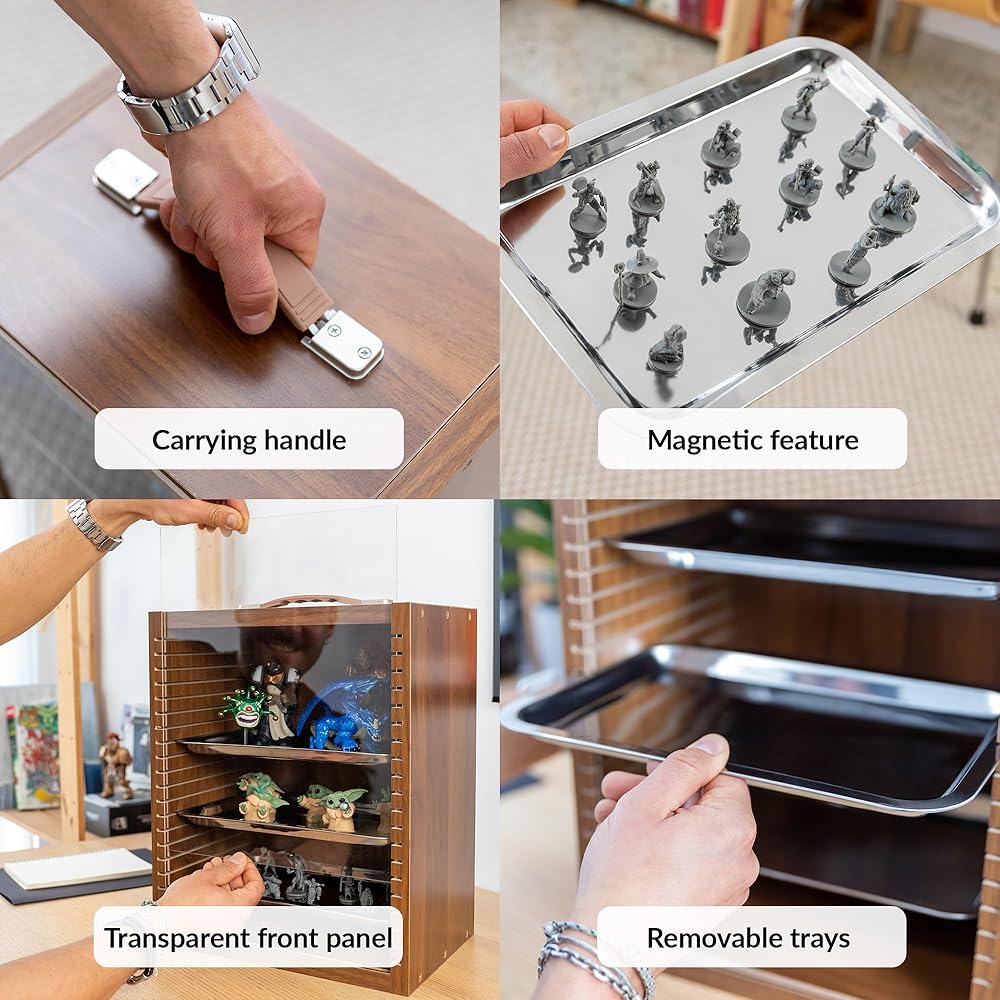 【تخصيص حسب احتياجاتك】تم تصميم علبة العرض ذات الأرفف لتناسب المنمنمات من جميع الأشكال والأحجام. نموذجنا يأتي مع 5 صواني معدنية قابلة للإزالة. ما عليك سوى تحريكها للداخل والخارج وضبط ارتفاع كل مستوى لتوفير مساحة أكبر لمنمنماتك. يحافظ السطح المغناطيسي للصواني على القواعد المعدنية لتماثيلك المفضلة في مكانها بشكل آمن!