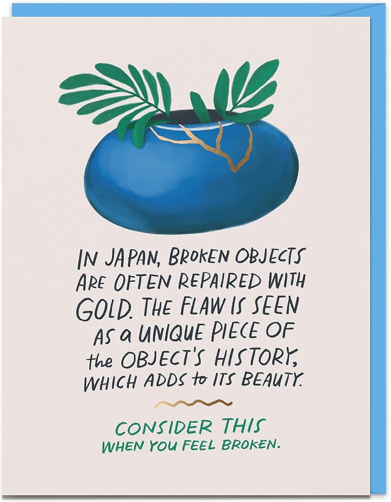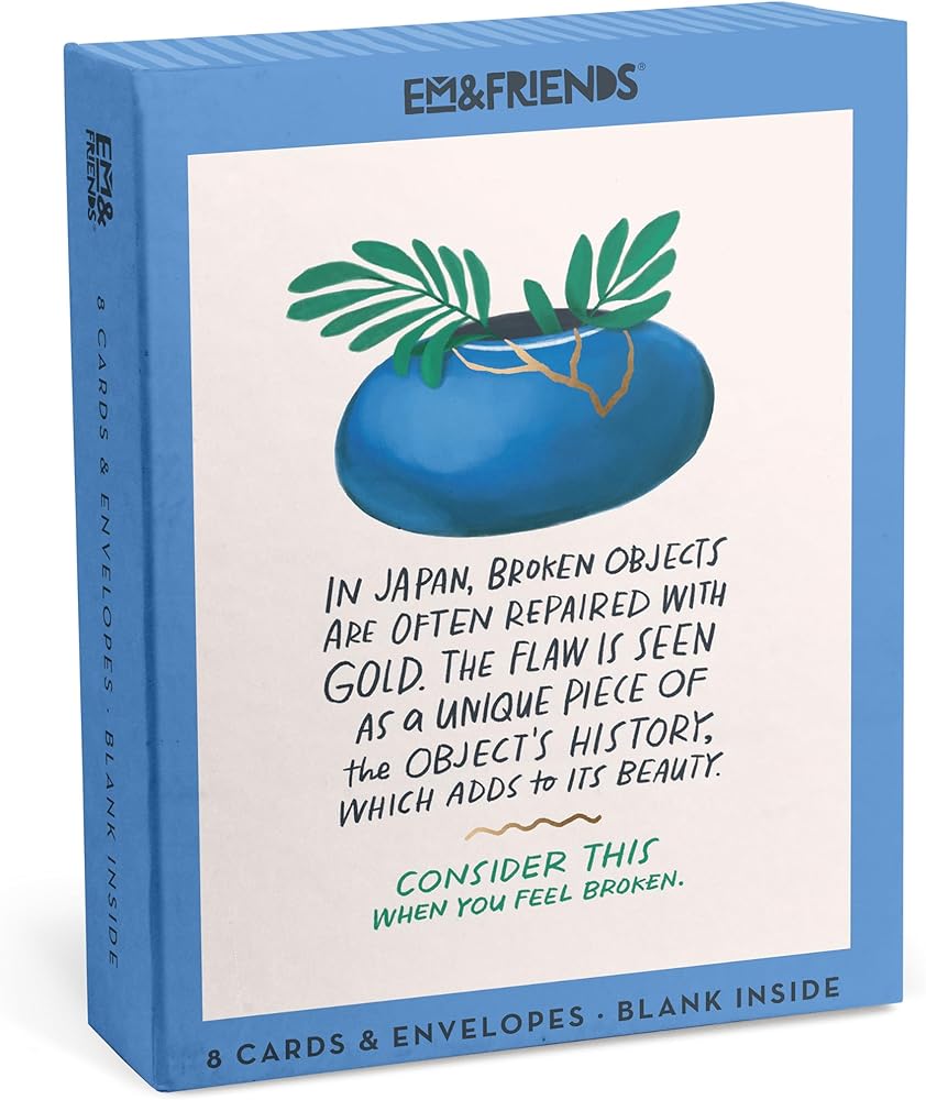 Includes: box of eight (8) of Em & Friends bestselling Empathy Cards, titled: Broken Objects. Cards are blank inside and 4.25 x 5.5 inches; includes 8 kraft envelopes and comes in storage box with hinged lid. When you need to let someone know that the things we survive are what make us magnificent, consider this Japanese custom, called kintsugi. Perfect when you or someone you care about needs a beautiful reminder that they are not broken. Then maybe take them to sushi, another Japanese custom that always makes me feel better ... but doesn't really make for a poetic greeting card.