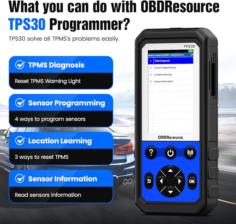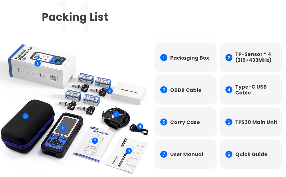 4 وظيفة TPMS في 1: مبرمج أداة برمجة TPMS العالمية، أداة تشخيص TPMS، أداة قارئ TPMS، أداة إعادة تعيين TPMS، أداة إعادة تعلم TPMS. وهذا يعني أنه يمكنك من خلال هذه الأداة برمجة المستشعر ثم تنشيطه، كما يمكن استخدامه لتشخيص نظام مراقبة ضغط الإطارات (TPMS) في الوقت اليومي.