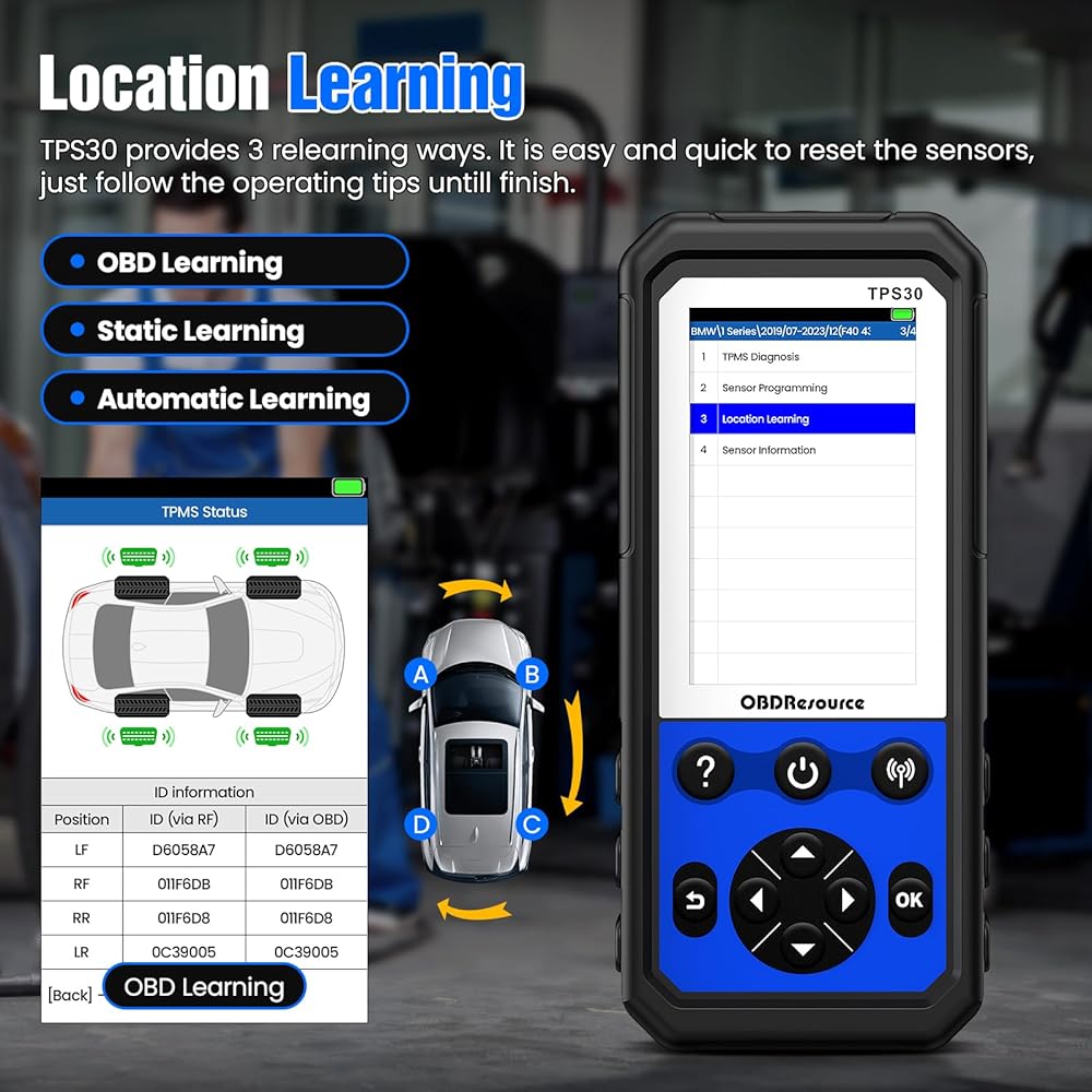 3 طرق لتعلم الموقع: هذه أداة إعادة ضبط TPMS أداة إعادة تعلم TPMS مع 3 طرق لإعادة إعادة الضبط. هذا هو: 1 تعلم obd، 2 تعلم ثابت، 3 تعلم تلقائي.