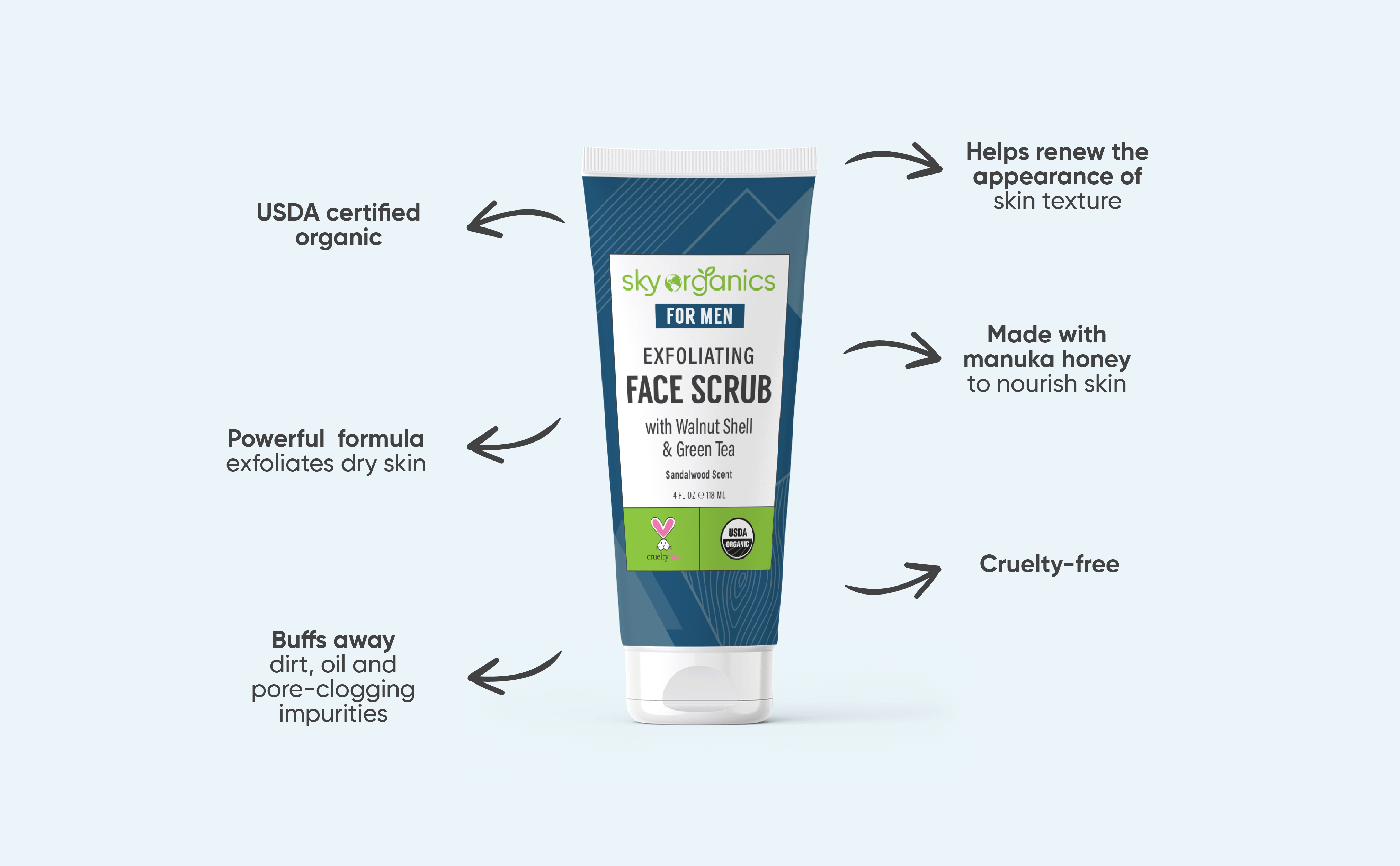 احصلي على بشرة أكثر نعومة ونقاءً مع مقشر الوجه الخاص بنا. يعمل مقشر الوجه الرجالي الخاص بنا على إزالة البشرة الجافة والباهتة والشوائب التي تسد المسام بلطف مع قشرة الجوز المطحون المقشر، بينما يعمل الشاي الأخضر الغني بمضادات الأكسدة على إنعاش البشرة وتلطيفها. تركيبتنا العضوية المعتمدة من وزارة الزراعة الأمريكية خالية من البارابين والفثالات والسيليكون والزيوت المعدنية.
