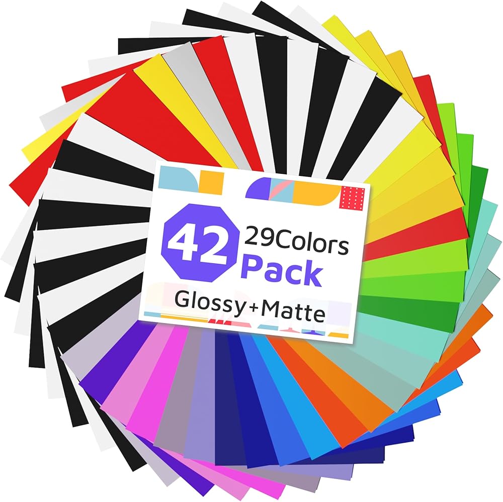 [حزمة الفينيل متعددة الألوان] تتضمن 42 ورقة من أوراق الفينيل الدائمة اللامعة (12 بوصة × 12 بوصة)، تغطي 29 لونًا تقليديًا، مما يخلق مشاريع عملية طويلة الأمد. ملاحظة: لا يتم تضمين ورق النقل.
