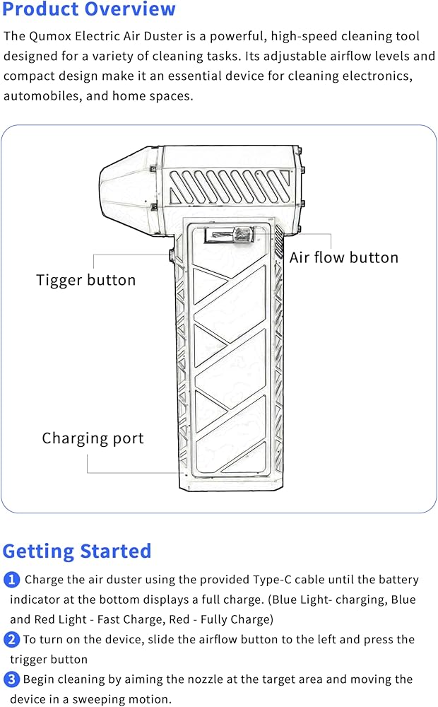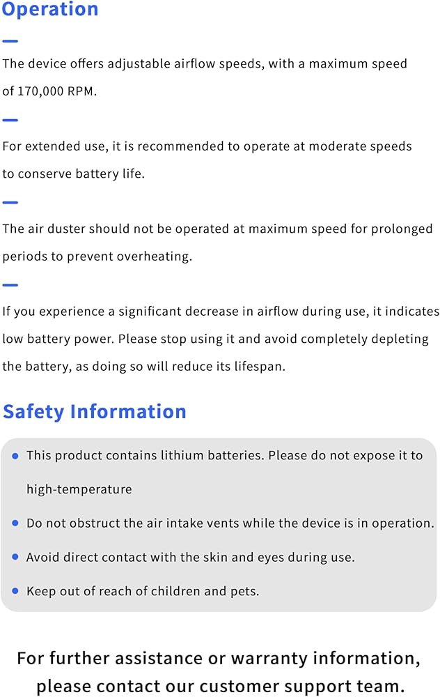 5.Caution for Usage: To ensure optimal performance, it is advised to avoid running the blower at maximum speed for prolonged periods. For longer usage, it is recommended to use a moderate speed setting. Recharge the blower when the airflow decreases, and always charge it in a well-ventilated area.