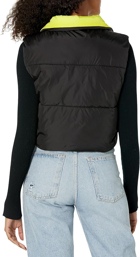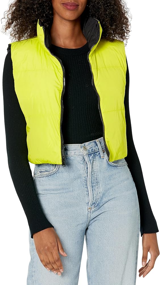 The Daisy Vest is a sporty yet casual cropped sleeveless puffer vest with a high-neck collar and zipper front.