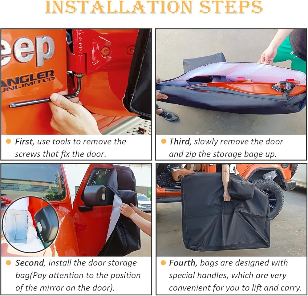 • 【سهلة التركيب】: أولاً، استخدم الأدوات لإزالة البراغي التي تثبت الباب. ثم لا تقم بإزالة الباب لأسفل ولكن قم بتثبيت حقيبة تخزين الباب أولاً (انتبه إلى موضع المرآة على الباب). بعد التثبيت، قم بإزالة الباب ببطء مع تثبيت حقيبة التخزين. تم تصميم الحقائب بمقابض خاصة، وهي مريحة للغاية بالنسبة لك لرفع الباب وحمله. مزيد من التفاصيل يمكنك مشاهدة الفيديو المقدم من PEATOVIE