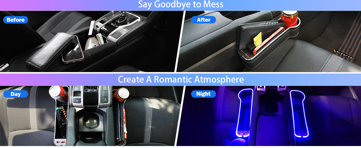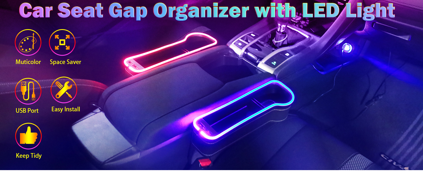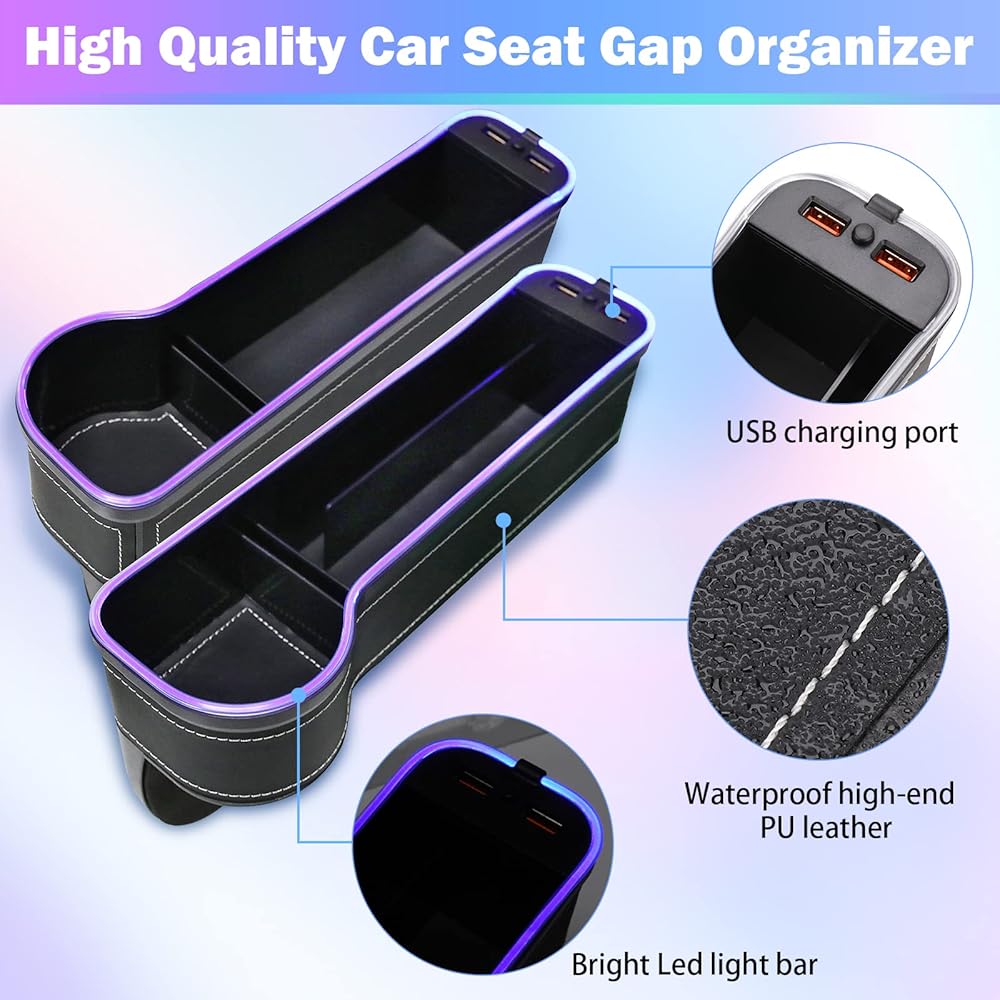 💡【شريط إضاءة متغير 7 ألوان】يحتوي شريط الإضاءة العلوي لملء فجوة مقعد السيارة على 7 ألوان قابلة للتبديل، والتي يمكن تغييرها وتعديلها بالضغط على الزر الموجود في منتصف منفذي شحن USB. يتغير لون RGB تلقائيًا، ثلاثة ألوان (أحمر، أخضر، أزرق) قابلة للتثبيت. خلق جو مريح لسيارتك.