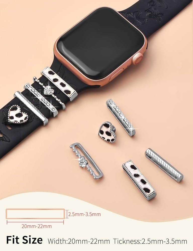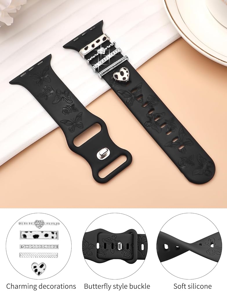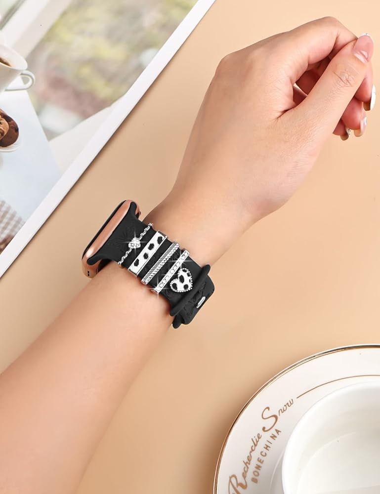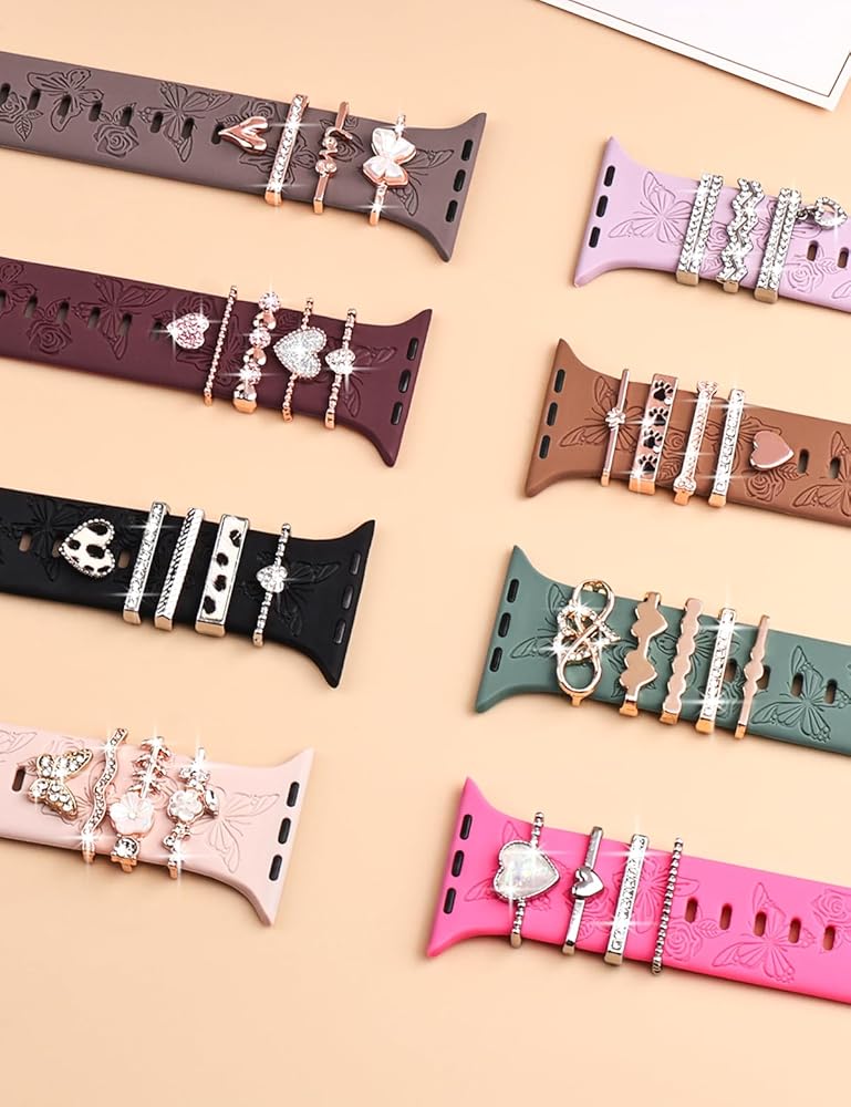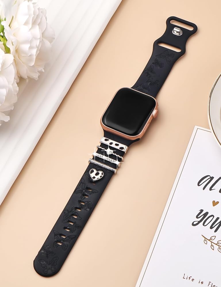 Watbro شريط منقوش بالزهور وحلقات زخرفية متوافقة مع أساور ساعة Apple 40 مم للنساء 38 مم 41 مم، سوار رياضي من السيليكون الناعم مع سحر ساعة Apple المزخرفة لسلسلة iWatch 9 8 7 6 5 4 3 2 1 SE