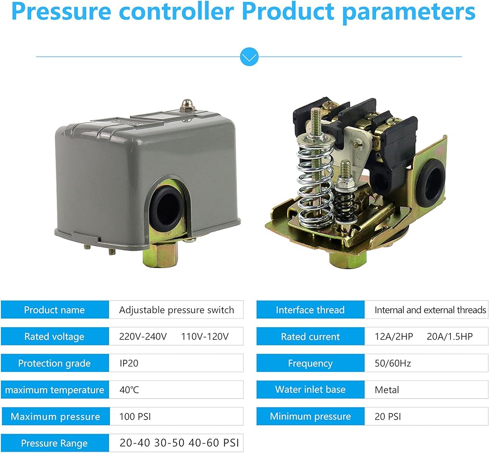 • This is 1/4" Female NPT, standard water well pump control switch,There are two springs in the controller, which are convenient and accurate to adjust.