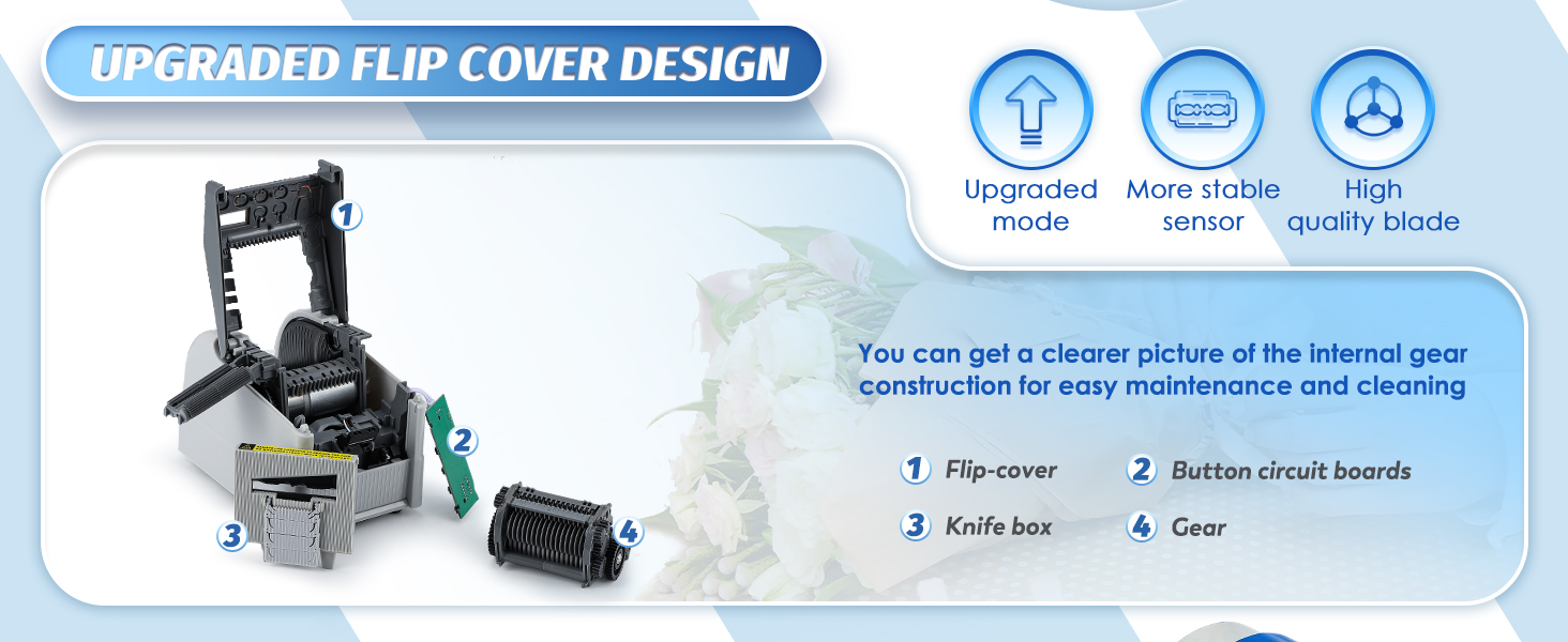 عجلة سيليكون بالكامل --- آلة قطع الأشرطة لدينا تستخدم السيليكون كمادة تروس، الأمر الذي لا يجعل الماكينة أكثر متانة فحسب، بل يضمن أيضًا الدخول السلس للشريط ويقلل من تشويش الشريط.