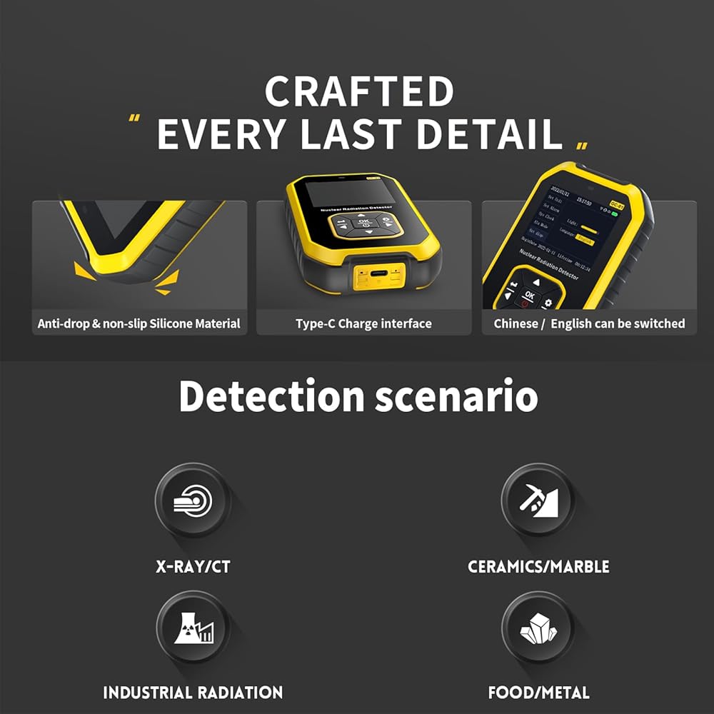 【Multifunctional Geiger Counter】Our the geiger counter has other various setting, such as system clock setting and unit setting & language change,you can operate in English (default) or Chinese. Easy one-handed operation.