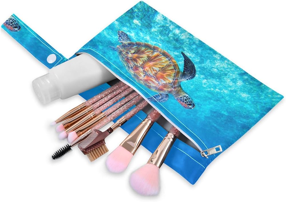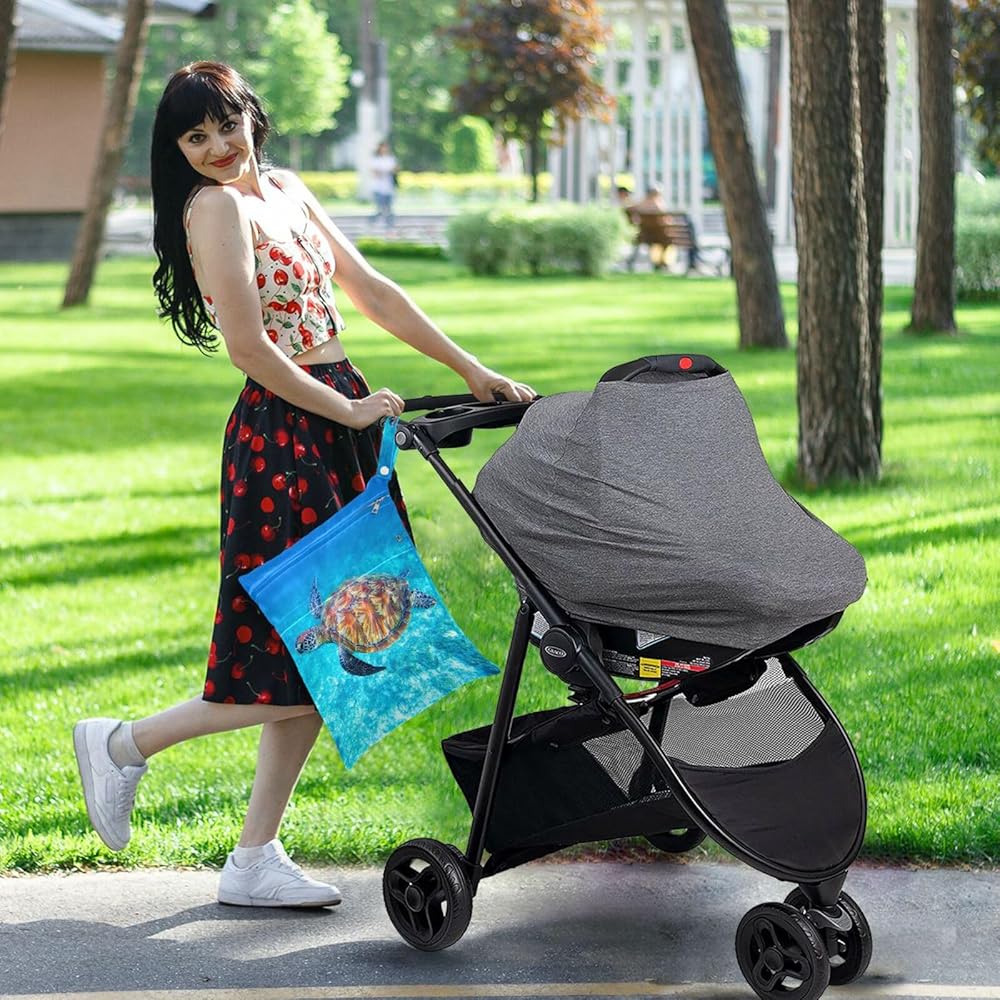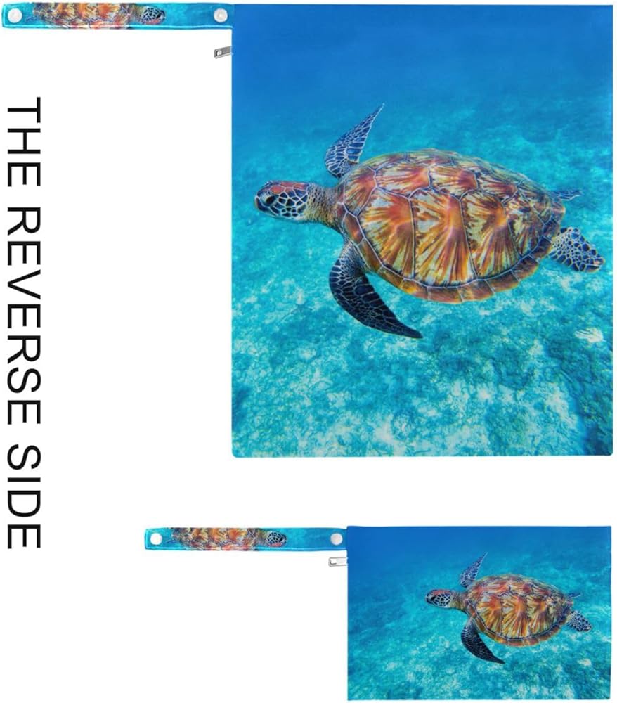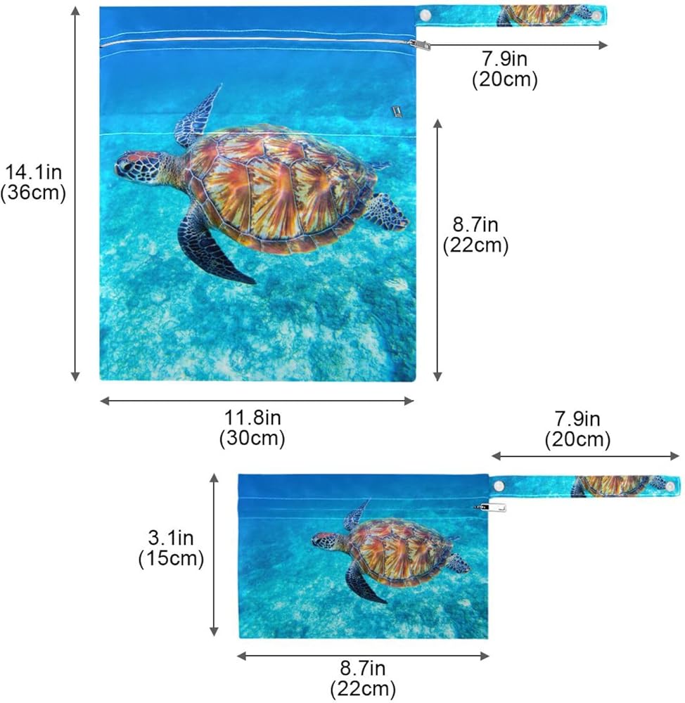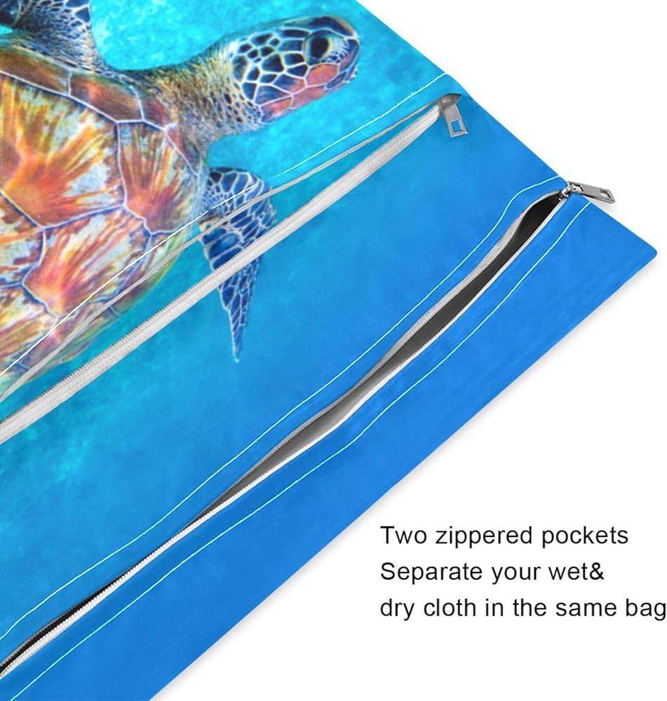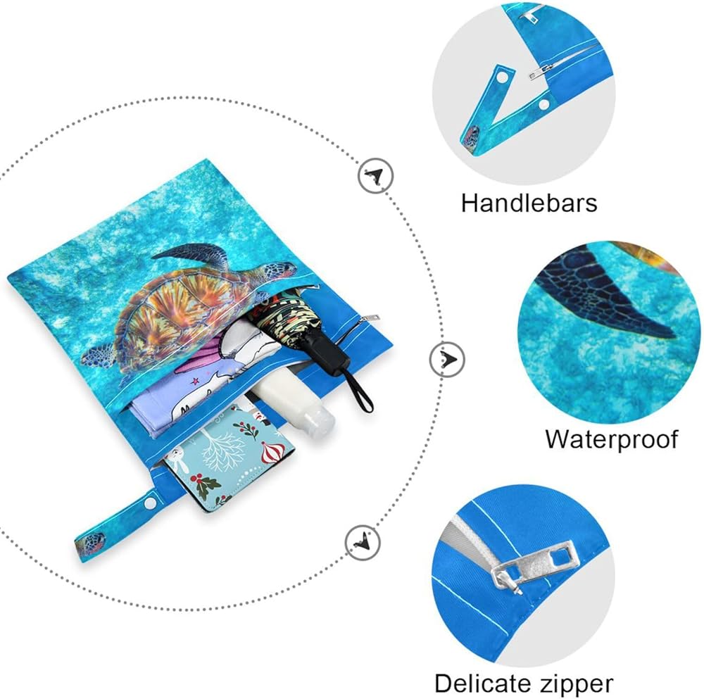 حقائب Susiyo القماشية للحفاضات الرطبة والجافة، حقائب مبللة مقاومة للماء وقابلة لإعادة الاستخدام مع سلحفاة البحر الأزرق مع جيبين بسحّاب، حقيبة أطفال للسفر على الشاطئ وحمام السباحة وحقيبة صالة الألعاب الرياضية للملابس المتسخة وملابس السباحة المبللة، عبوة من