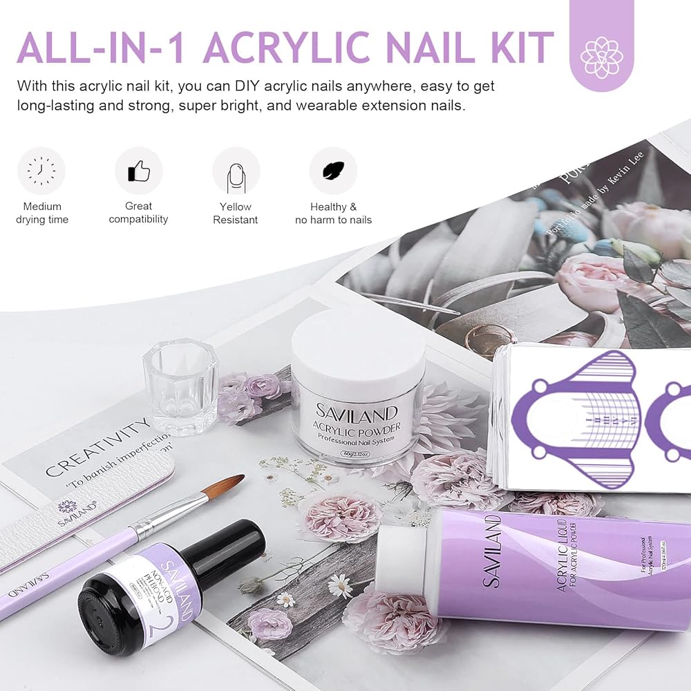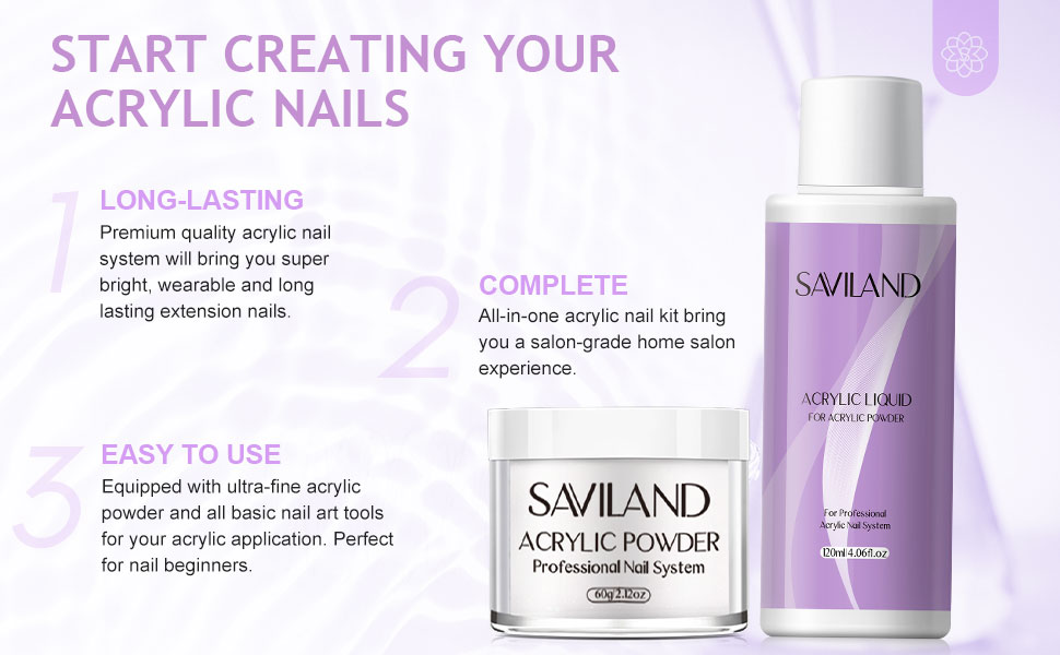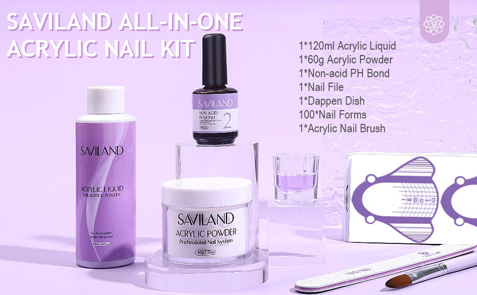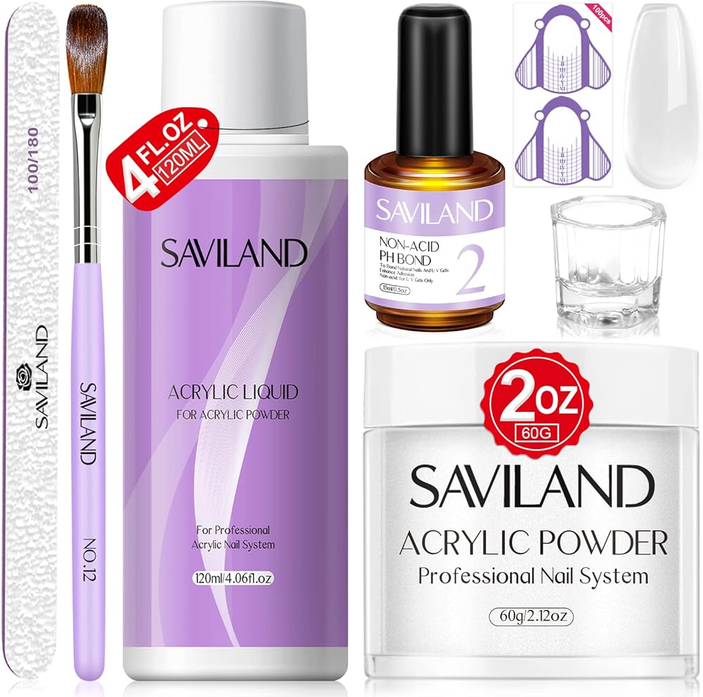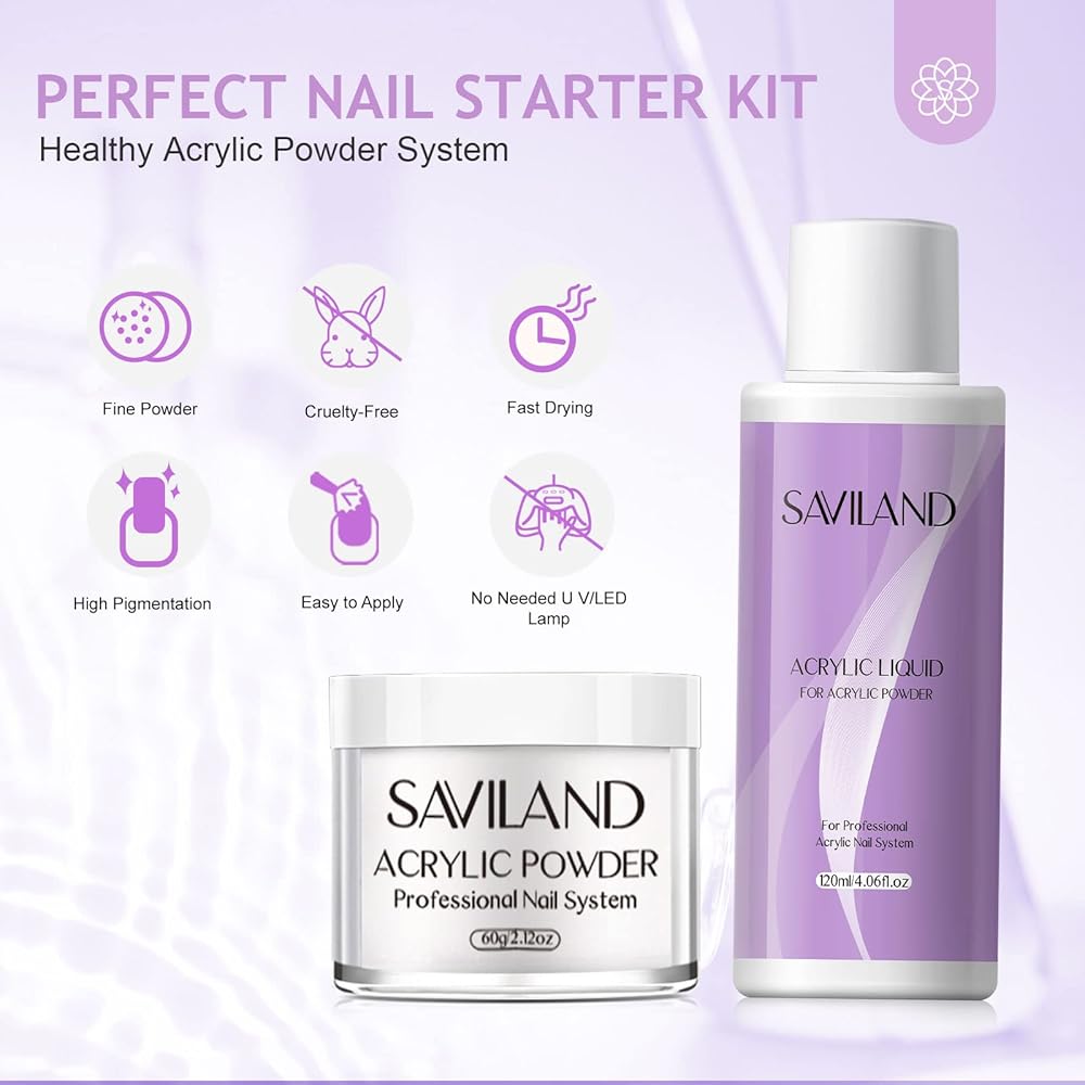 • 💜مجموعة أظافر أكريليك كاملة للاستخدام بنفسك - تحتوي مجموعة أظافر الأكريليك سافيلاند على 60 جرامًا من مسحوق أظافر الأكريليك الشفاف، و120 مل سائل أكريليك، وقطعة واحدة من رابطة درجة الحموضة غير الحمضية، وقطعة واحدة من فرشاة أظافر الأكريليك (مقاس 12)، و100 قطعة من أشكال الأظافر، وقطعة واحدة من مبرد الأظافر لتلبية احتياجاتك. احتياجات الاستخدام طويلة الأمد، تتضمن كل ما تحتاجه لبدء فن الأظافر الأكريليك أو DIY في المنزل، وإطلاق إبداعك!