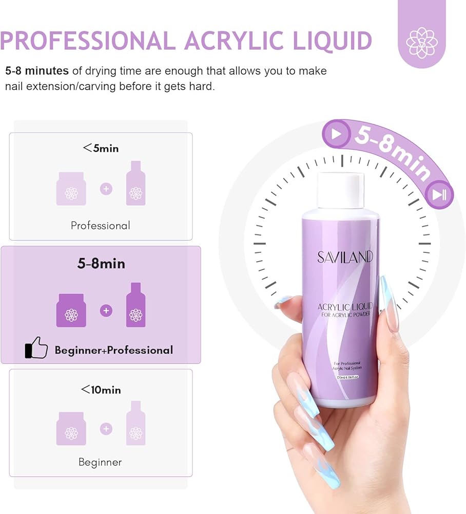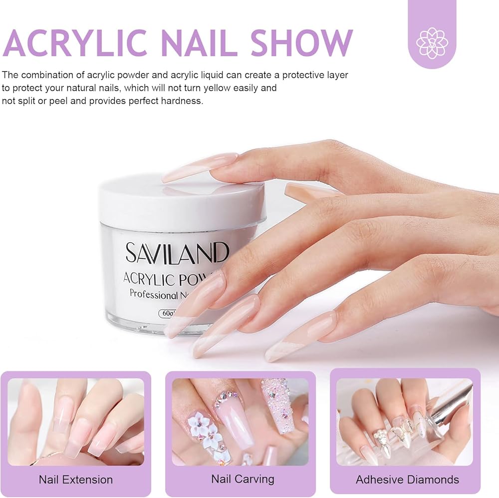 • 💜مجموعة أظافر أكريليك احترافية وسهلة الاستخدام - مجموعة مسحوق الأكريليك والسائل الكل في 1 من سافيلاند هي مجموعة أظافر الشريك المثالي لنظام الأكريليك. جميع المنتجات الموجودة في مجموعة الأكريليك هذه ذات جودة عالية وسهلة الاستخدام. مزيج مسحوق الأكريليك ومجموعة السائل يمكن أن يخلق طبقة واقية لحماية أظافرك الطبيعية، والتي لن تتحول إلى اللون الأصفر بسهولة ولا تتقصف أو تتقشر وتوفر صلابة مثالية. على الأقل يمكن الحفاظ عليه لمدة 28 يومًا تقريبًا.