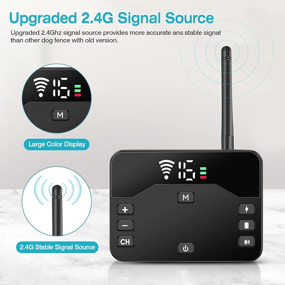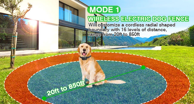 🐶【وضع سياج كهربائي لاسلكي متقدم】تحت وضع سياج الكلاب اللاسلكي، سيقوم نظام سياج الكلاب الكهربائي بتخصيص حدود لاسلكية على شكل شعاعي مع 16 مستوى من المسافة، نطاق الإشارة من 20 قدمًا إلى 850 قدمًا. عندما يكون كلبك خارج النطاق، سيصدر طوق الكلب المتلقي نغمة تحذيرية واهتزازًا ثم صدمة كهروستاتيكية خفيفة بجهد منخفض 3.7 فولت لتذكير كلبك بالعودة.