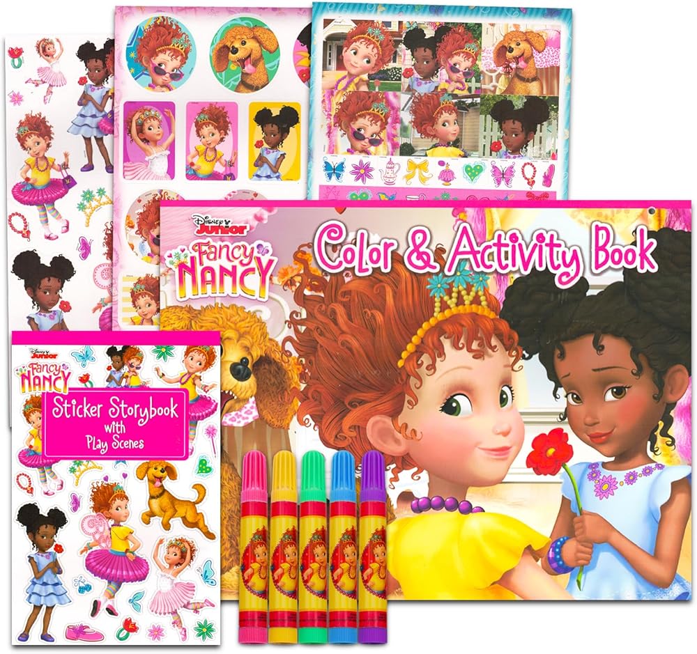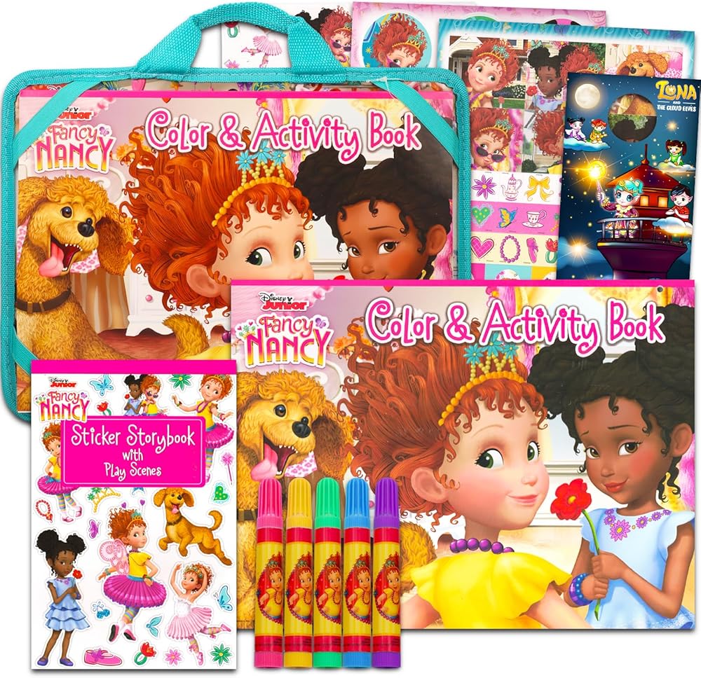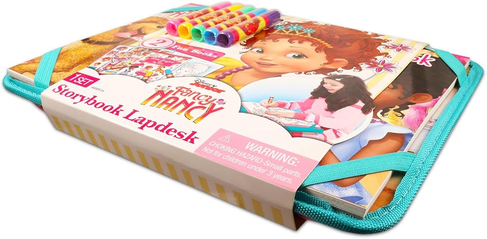 Crenstone Exclusive Fancy Nancy Lap Desk Activity Set for Kids - Bundle with Fancy Nancy Art Kit with Lap Desk, Coloring Pages, Stickers, More | Travel Lapdesk for Girls. This Fancy Nancy lapdesk set includes a cusioned lap desk for kids with a coloring and activity book, stickers, and crayons all featuring Fancy Nancy artwork. Sure to be a hit with Fancy Nancy fans of all ages, this activity lap desk is perfect to give as a gift to your favorite Fancy Nancy enthusiast. This Fancy Nancy lap desk for kids is perfect for travel, car trips, school supplies, party favors, party supplies, and more. Officially licensed Fancy Nancy activity set for kids also includes a bonus Luna and the Cloud Elves door hanger.