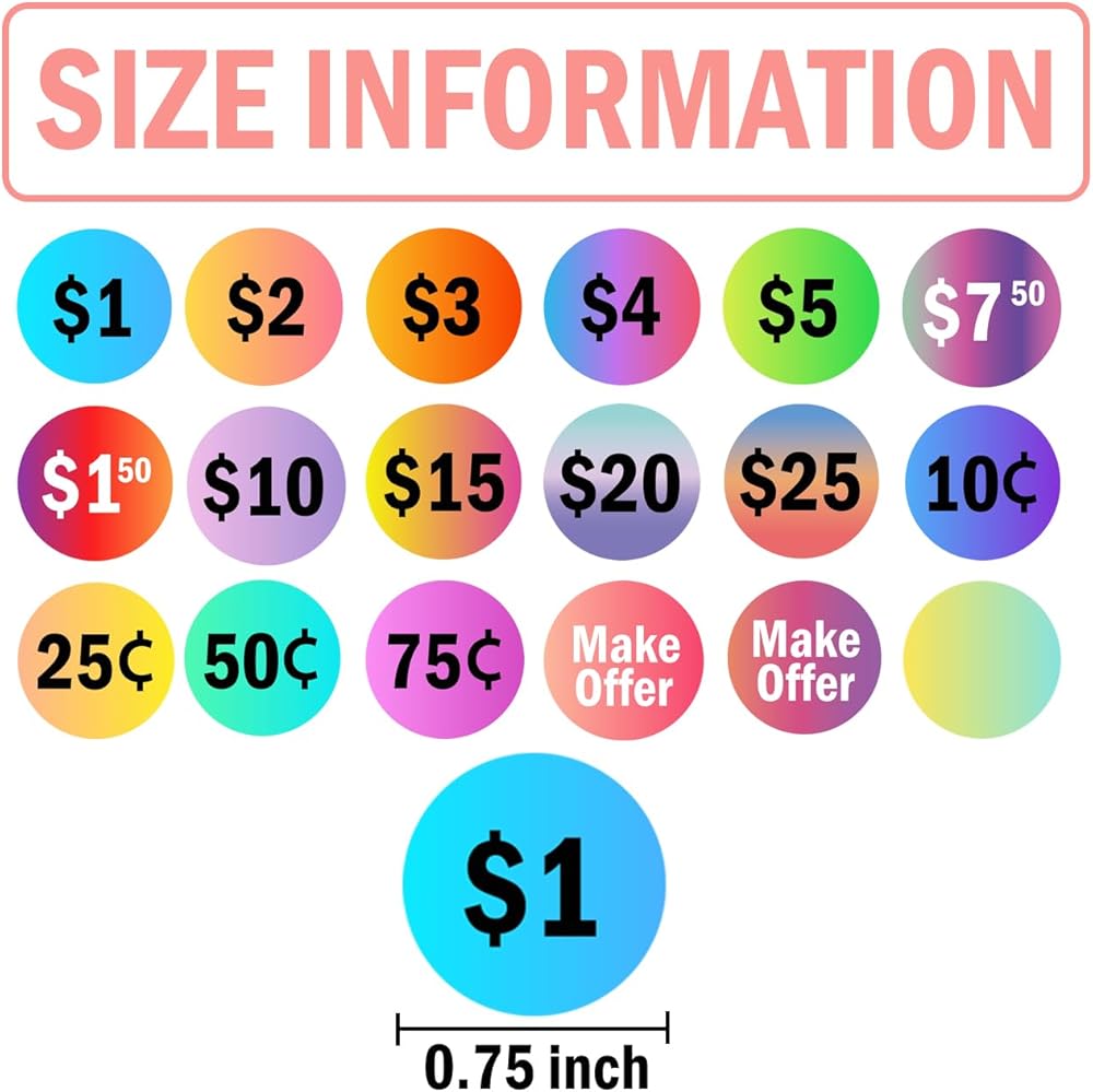 • 1 inch yard sale price stickers available in 18 different gradient color, you will receive 20 sheets garage sale pre-priced pricing labels,each sheet of 36 pcs pricing stickers, totally 720 pcs price stickers.