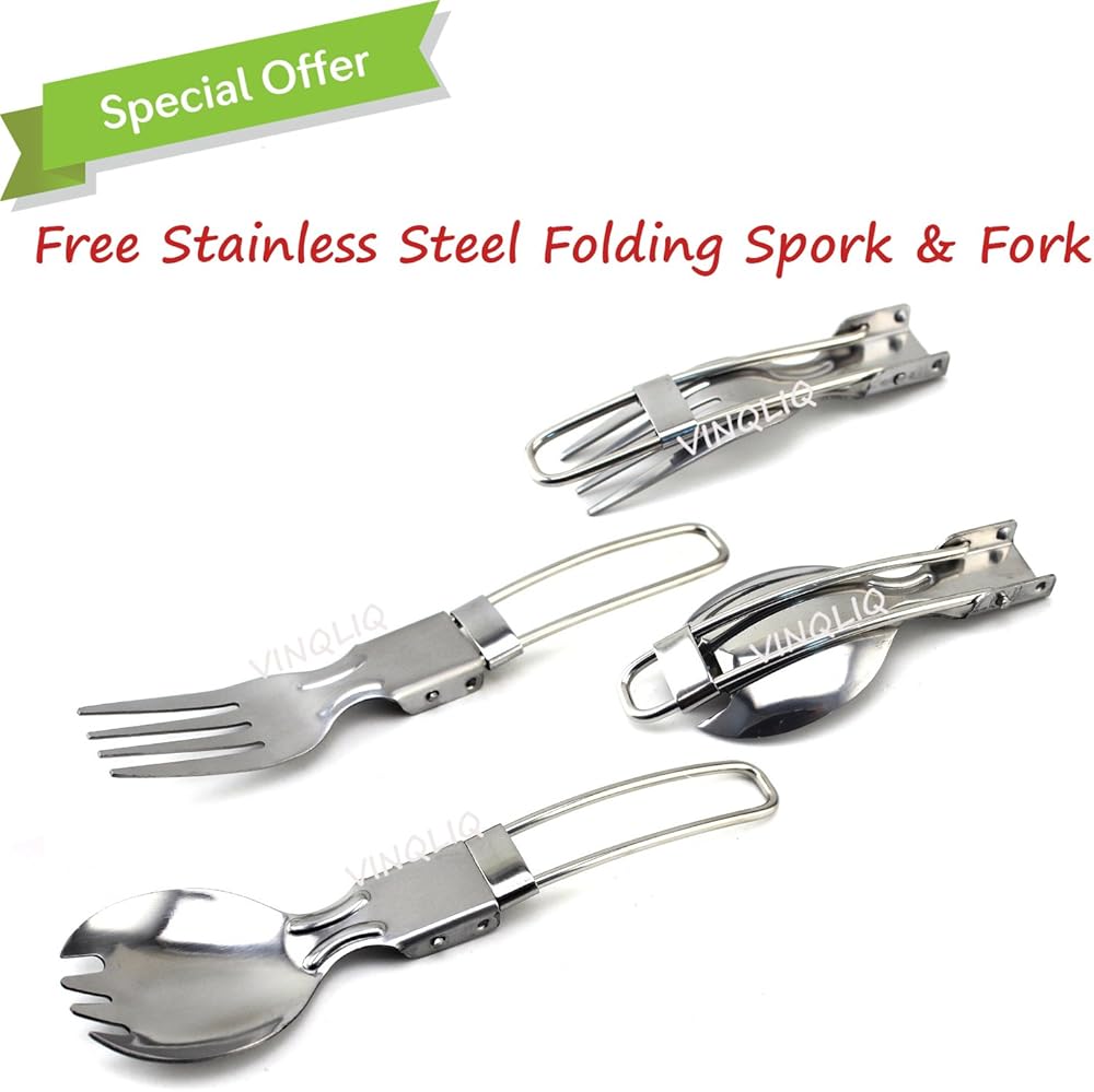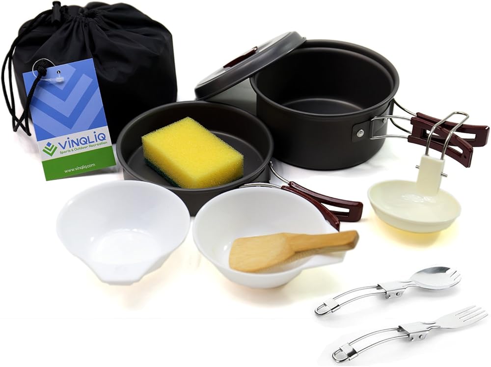Vinqliq Camping Cookware Set is designed for Camping, Backpacker, Hiking Picnic and Other Outdoor Activities. It is suitable for 1-2 people. It weighs a total of only 0.8 LBS. Handles on pot, frying pan and soup spoon are foldable, the complete Set can be packed in one Nylon bag to take up very little space. The total set measures 3.5" (H) x 6.1" (Diameter). It is important to select a cook set that is both practical and effective to enjoy your free time in Outdoor Activities.