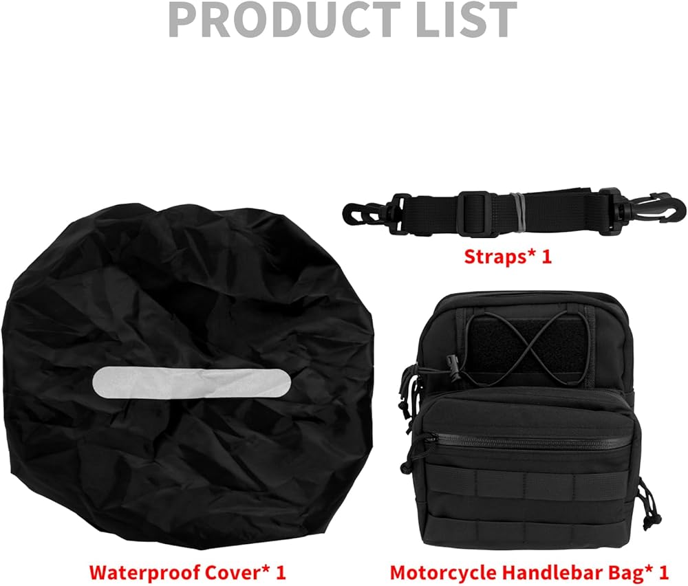 - 1 × حقيبة مقود الدراجة النارية + 1 × حزام كتف + 1 × غطاء مقاوم للماء متضمن.