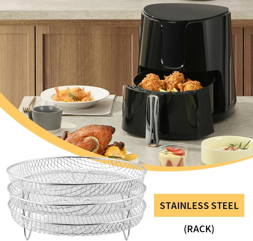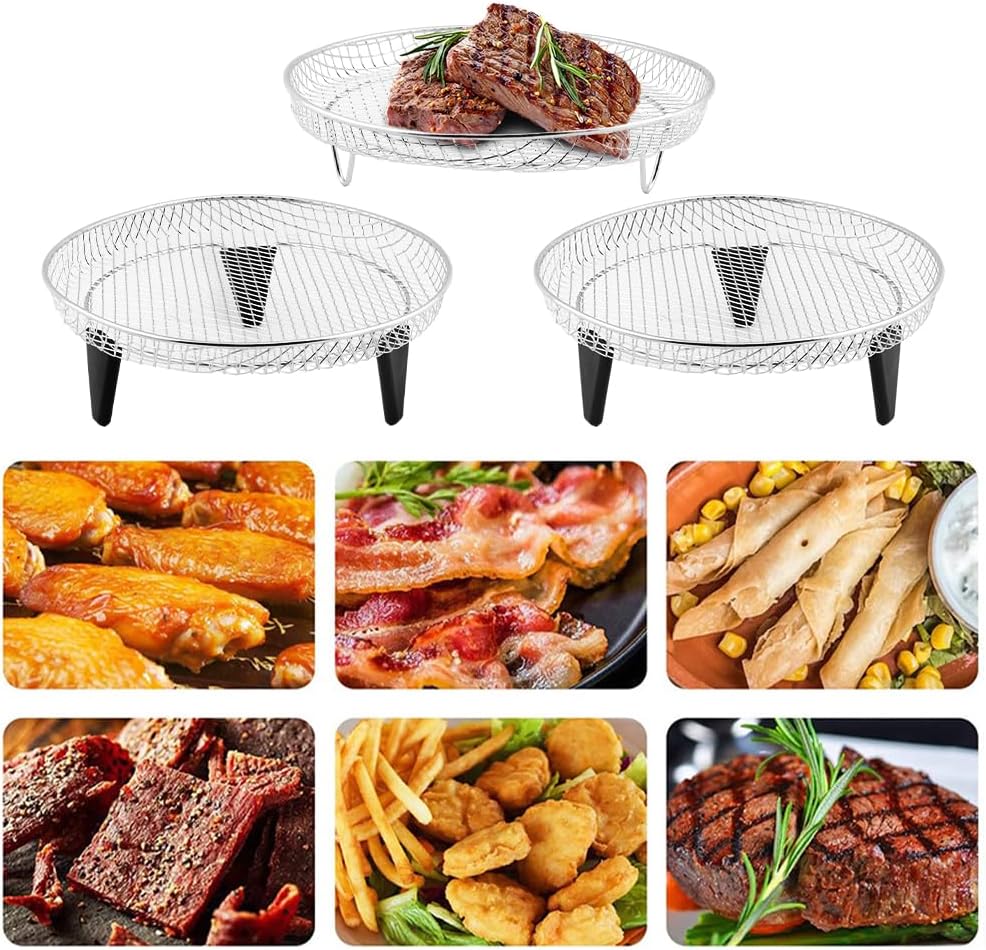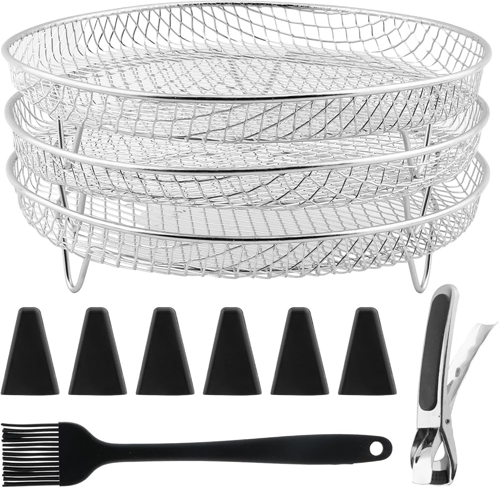 ملحقات مقلاة الهواء، 3 طبقات رفوف تجفيف قابلة للتكديس، صينية سلة مقلاة هوائية من الفولاذ المقاوم للصدأ، رف تجفيف مع فرشاة زيت، مشبك طعام وأقدام رفع (كما هو موضح)