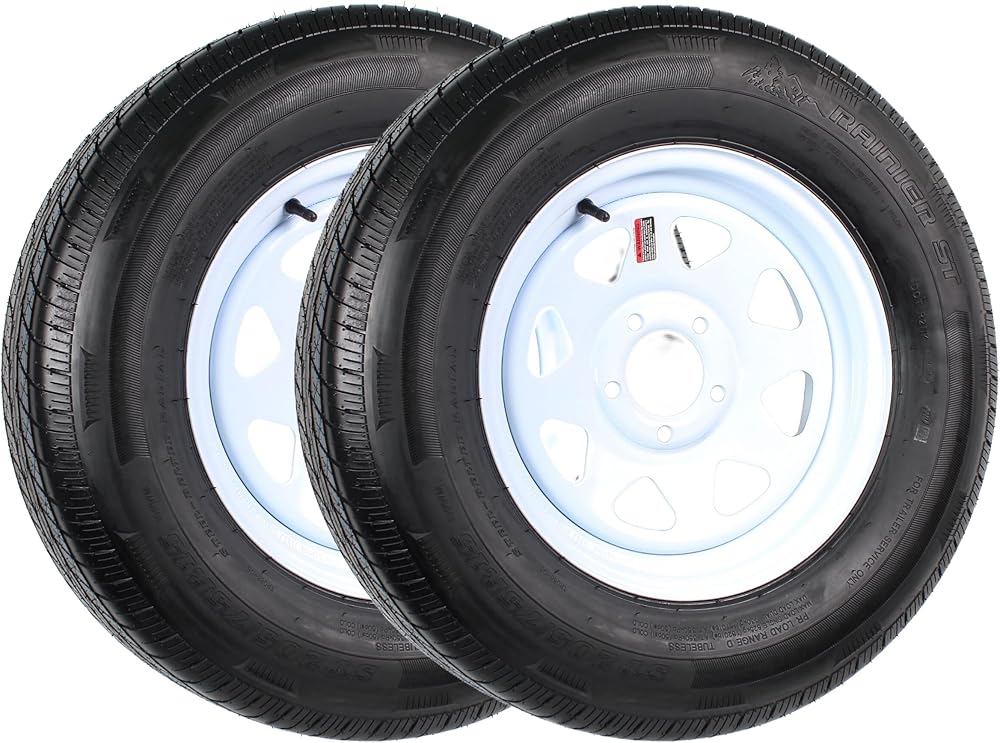 Pre-Mounted Trailer Tires & Wheels. 2-Pack Trailer Tires & Rims Radial 205/75R15 Load D 5-4.5" White Spoke 15". Tire Size: 205/75R15. Aspect Ratio: 75. Section Width: 205. Load Range: D. Tire Weight Rating: 2150 Lbs.. Maximum Pressure: 65 PSI. Tire Composition: 8 Ply. Tread Depth: 7.8/32". Sidewall Description: BSW. Speed Index: M. Load Index: 107/102. Internal Tire Type: Tubeless. Rim Size: 15" X 5". Bolt Configuration: 5 Lug 4.5" Center. Offset: 0". Center Bore: 3.19". Rim Construction: Steel. Rim Style: Spoke. Rim Color: White. Wheel Hub Diameter: 6.50". Lug Value Hole: 0.45". Hub Stud Size/Nut Requirement: 1/2"-20 60 Degree Cone Nut. Torque Specifications: 90-120 Ft/Lbs.. Warranty: Six Years. Pack Quantity - 2-Pack
