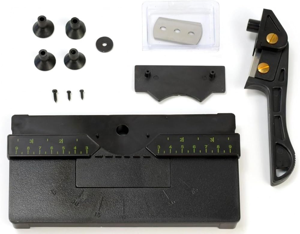 • In the box you will find the following items: cutting guillotine with an adjustable angle from 45 to 90 degrees, a spare blade for additional cutting and a 'martyr' (part of the base that is marked by the cut).